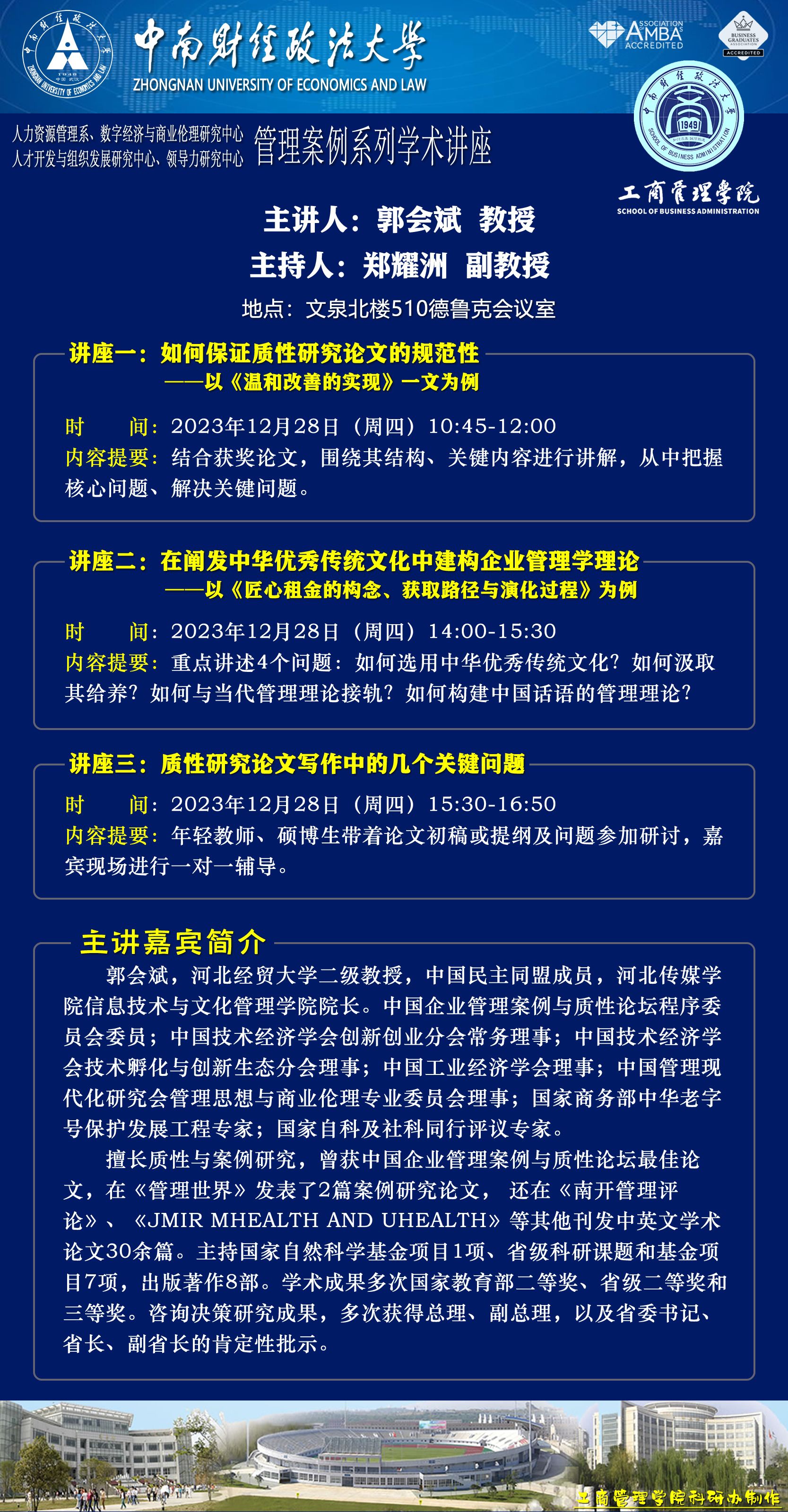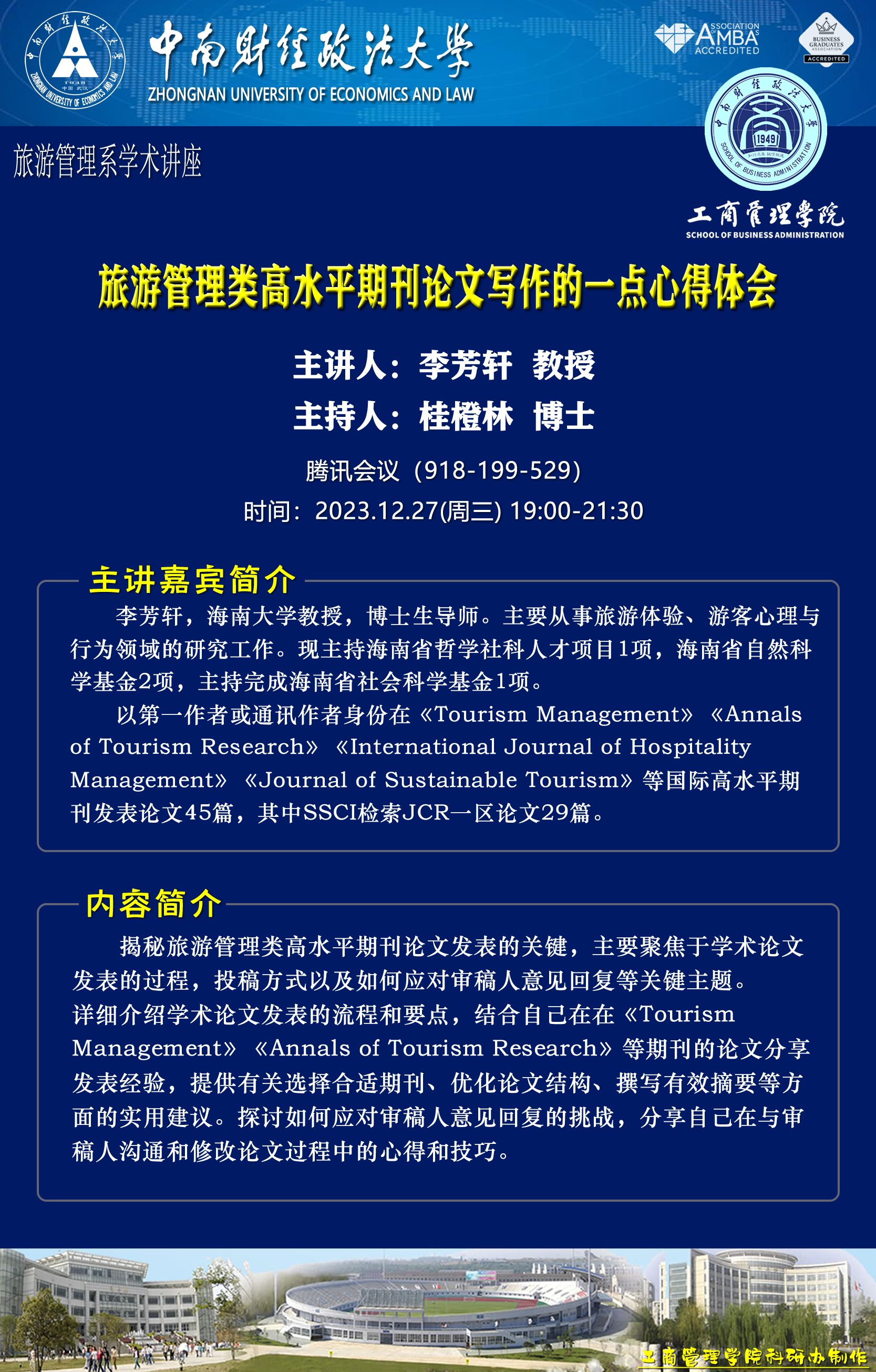 时间地点主办单位主持人主讲人主题2023.12.27 19:00-21:30腾讯会议:918-199-529旅游管理系桂橙林 博士李芳轩 教授旅游管理类高水平期刊论文写作的一点心得体会2023.12.2810:45-12:00;14:00-16:50文泉北楼510德鲁克会议室人力资源管理系、数字经济与商业伦理研究中心人才开发与组织发展研究中心、领导力研究中心郑耀洲 副教授郭会斌 教授讲座一:如何保证质性研究论文的规范性讲座二:在阐发中华优秀传统文化中建构企业管理学理论讲座三:质性研究论文写作中的几个关键问题