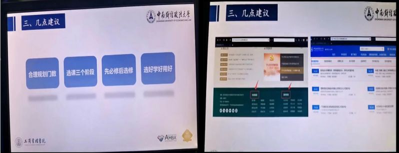 最后,吴老师给我们提出了几点建议。“合理规划门数”按照个人需求选择合适的课程学习;“选课三个阶段”在不同阶段对应不同做法;按照“先必修后选修”的顺序;“选好学好用好”,希望每个学生都能在大学阶段中选好课,对充分的了解和利用校园资源。