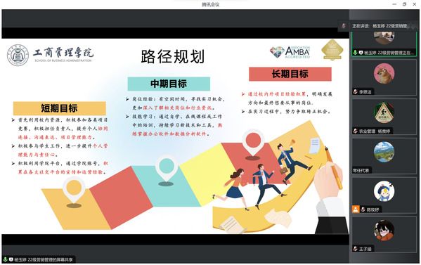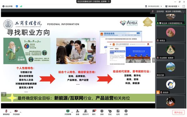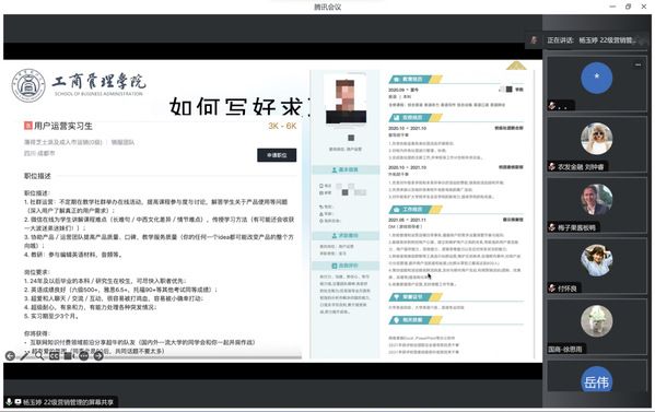 (通讯员:李思洁)为深入学习贯彻党的二十大精神,进一步落实落细就业优先政策,引导学院研究生做好个人发展规划,掌握求职技巧以提升求职竞争力,工商管理学院于2023年12月29日下午14:00在腾讯会议举办了第188期“研职有道之闪耀职场”——实习经验分享活动,本次活动邀请首届全国大学生职业规划大赛校赛银奖获得者杨玉婷同学作为主讲嘉宾,我院硕士研究生积极参与。