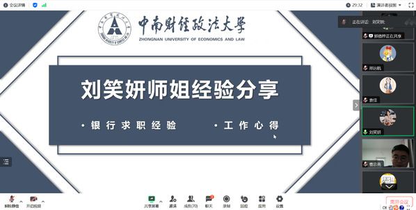 随后,任职于工行广州分行机构的刘笑妍同学分享了自己的求职经验。刘笑妍同学针对银行的选择、备考和签约这三个部分阐述了银行求职的技巧。她谈到,银行的选择应考虑地域因素,地域因素会影响工作压力和薪酬水平;备考过程中应充分掌握银行和金融知识,尽量提高笔试成绩。随后,刘笑妍同学分享了自身的工作心得:找准定位,设立目标;拒绝内耗,学会自洽。