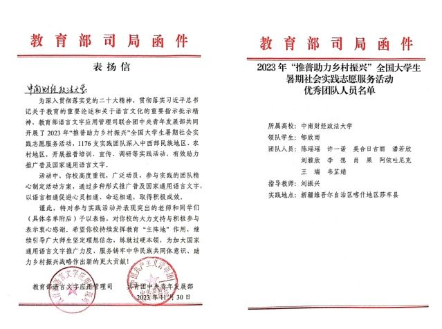 近日,2023年“推普助力乡村振兴”全国大学生暑期社会实践志愿服务活动评优结果公布,我院社会实践团队荣获“优秀团队”称号。教育部语言文字应用管理司和共青团中央青年发展部致函学校,对成功立项且表现突出的师生予以表扬,对我校师生团队在服务国家通用语言文字推广、服务铸牢中华民族共同体意识、助力乡村振兴战略中作出的贡献予以充分肯定。