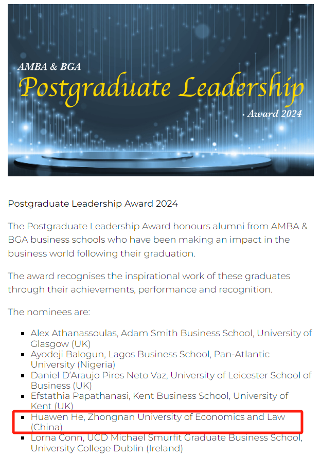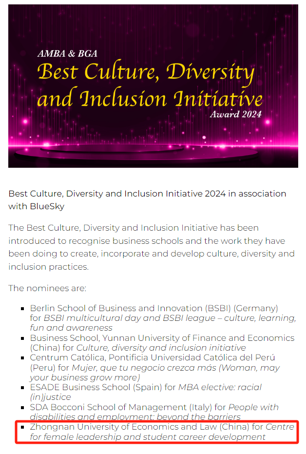 近日,2024年AMBA&BGA全球卓越奖(AMBA&BGA Excellence Awards)公布了获奖名单,我院女性领导力与大学生职业发展研究中心和MBA校友贺华文分获最佳文化、多样性和包容性举措奖(Best Culture, Diversity and Inclusion Initiative)以及研究生卓越领导力奖(Postgraduate Leadership Award)两项大奖的候选人提名,这也是我院自去年首获该国际评比的两项提名后,再次获得两项候选人提名。
