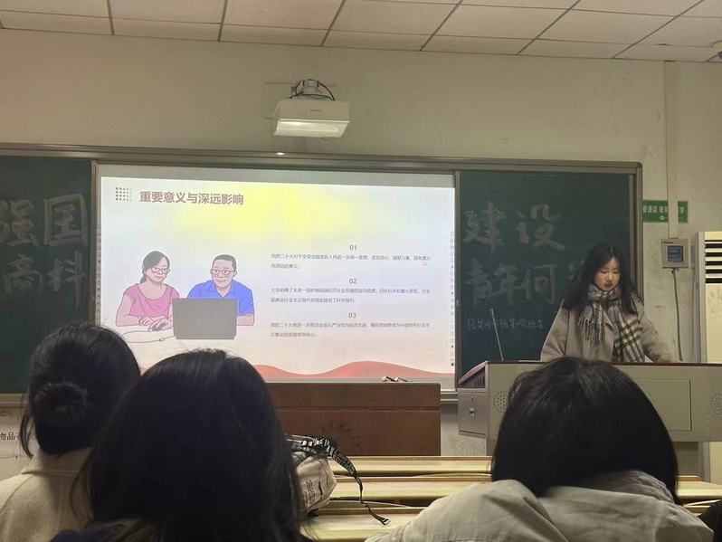 首先,王瑜平同学为同学们讲解了党的二十大精神。此次大会是在全党全国各族人民迈上全面建设社会主义现代化国家新征程、向第二个百年奋斗目标进军的关键时刻召开的一次十分重要的大会。学习贯彻党的二十大精神,就要深刻把握全面建成社会主义现代化强国总的战略安排和未来五年的主要目标任务,牢牢把握“坚持和加强党的全面领导”“坚持中国特色社会主义道路”“坚持以人民为中心的发展思想”“坚持深化改革开放”“坚持发扬斗争精神”的重大原则,埋头苦干、担当作为,不断推进社会主义现代化建设。