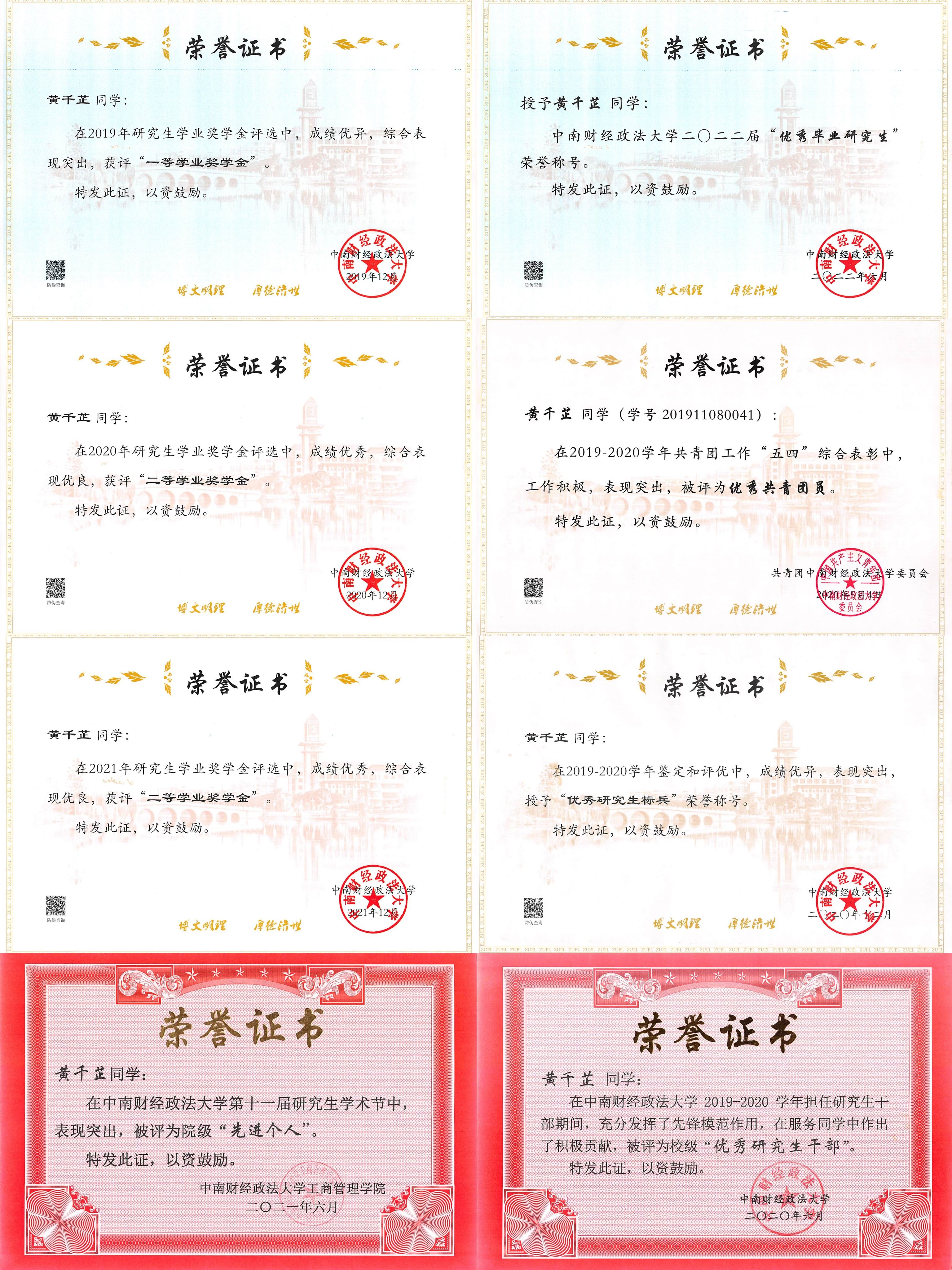 从本科起,黄千芷同学就对供应链管理领域产生了浓厚兴趣,主持《网红经济模式下服装行业柔性供应链需求分析及能力构建研究》“大创”项目获国家级立项,开启了她的科研之路,此后参与项目多次获“博文杯”重点立项,二等奖、三等奖结项。