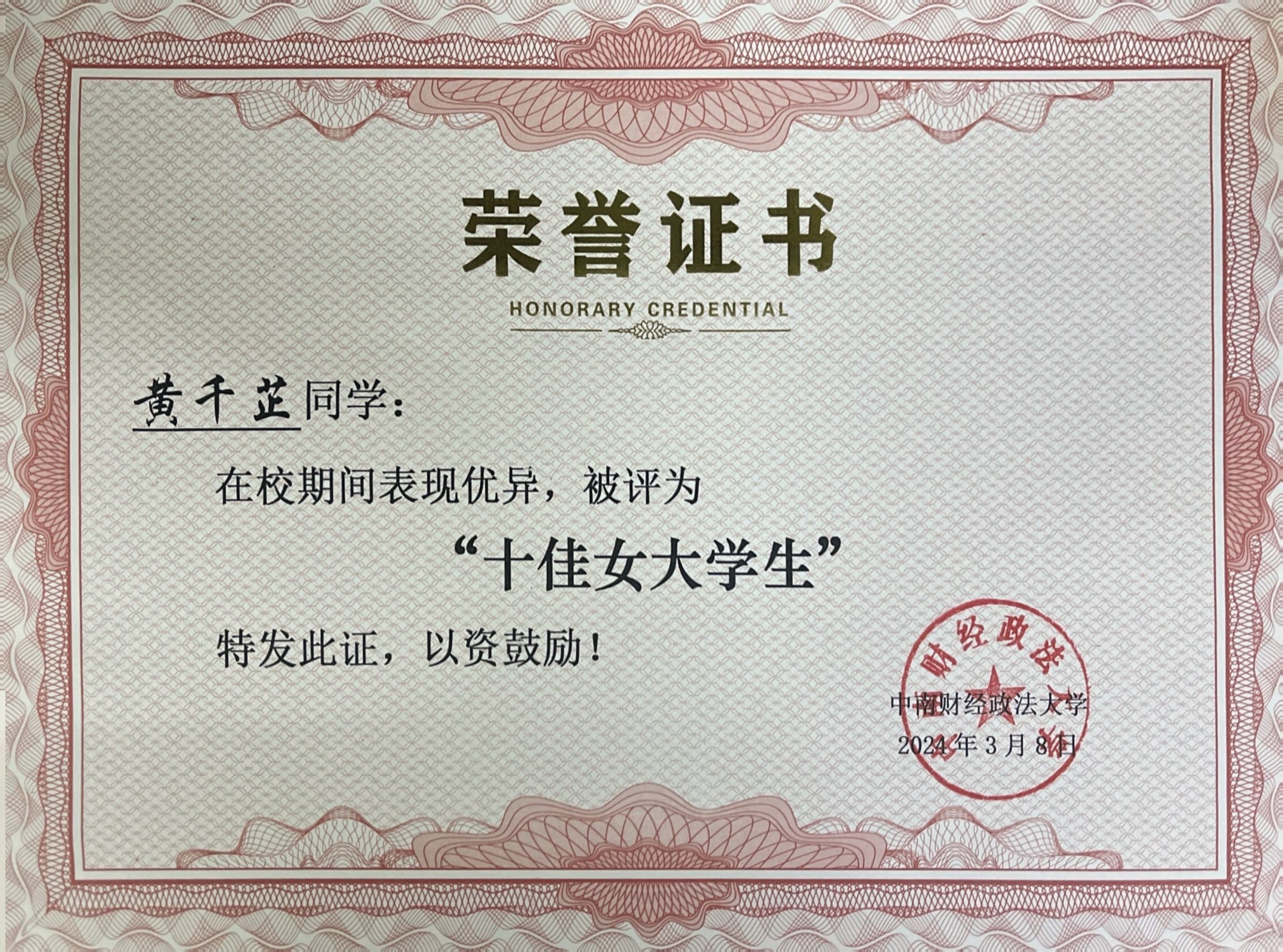 为学习宣传贯彻习近平新时代中国特色社会主义思想和党的二十大精神,展现我校女大学生奋发向上的精神风貌,彰显我校女大学生昂扬进取的青春风采,发挥新时代女大学生先进典型的示范引领作用,经学院推荐、学校评审小组综合审议,我院2023级企业管理博士研究生黄千芷荣获2024年米兰电竞·(中国区)“十佳女大学生”荣誉称号。