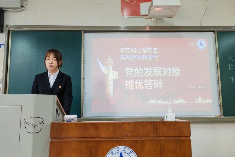在团推优阶段,三位同学依次上台进行了团推优的答辩。文栋同学从对党的认识,入党动机,个人综合表现和未来展望四方面展开答辩,不仅明确了党的指导思想、党的组织建设和党员责任,并且受家庭教育和党员先锋模范精神的正向影响,以积极向上的态度不断向党组织靠拢。彭永慧同学在党章学习中提升政治素养,以生活和工作的经历表现出服务奉献的精神,同时在其他领域多样化拓展发展,不忘初心使命,不懈奋斗前进。浦玙凡同学表示,她一贯坚持以党员标准要求自己,定期撰写思想报告并及时反馈,重视理论知识的深度和广度,结合国家大事多方位思考,积极参加志愿活动并坚持为人民服务。