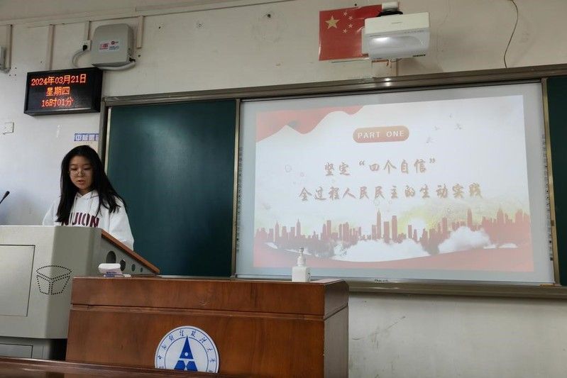 团支书陆宇涵同学带领我们进行理论学习,首先以提问“四个自信是什么”的方式引入主题,结合图文细致地讲解四个自信的形成过程与深远影响。在认真听讲后,同学们对四个自信的具体内涵和意义有了更清楚更全面的认识,更加坚信中国特色社会主义道路是实现社会主义现代化的必由之路,是创造人民美好生活的必由之路。