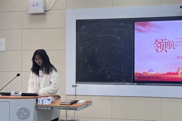 本次团日活动分为两部分,第一部分是“领航掌舵谋全局,奋楫扬帆新征程”理论学习。主持人带领同学们深入学习贯彻习近平总书记在2024年全国两会期间的重要讲话精神,引导同学们在不同制度的比较中深刻感悟我国国家制度和国家治理体系的显著优势,鼓励大家有序参与社会主义民主政治实践,更加坚定制度自信。