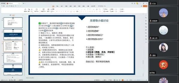 最后,唐浩月同学从面试标准、个人发言和角色选择者三个方面分享了无领导小组讨论的面试技巧。她提到,在面试标准方面面试官一般围绕框架、逻辑、关键意见和团队协作四个方面评价求职者;在个人发言方面求职者应做到说结果、定标准、说理由和做记录;在角色选择方面应结合自己的特质选择合适的角色。
