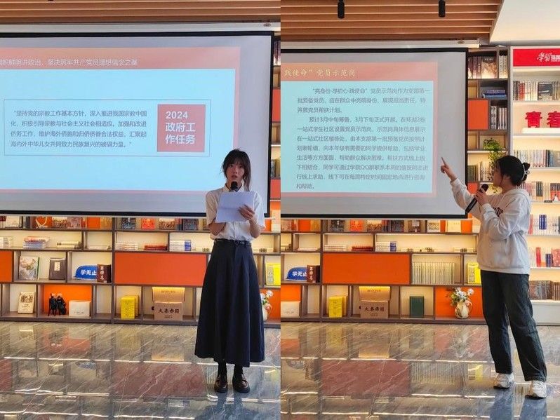 3月29日,工商管理学院本科2022级党员同学们在倍阅书店开展3月主题党日活动。集中学习党章后,领学人肖云雅带领支部成员学习中国共产党党员网络行为规定,强调网络安全事关国家安全,党员在认识到网络重要性的同时,要严格规范网络行为,树立网络安全防范意识。聂星洋同学领学习近平总书记有关讲话精神,表明了我党在未来深入推进党的自我革命、坚决打赢反腐败斗争攻坚战持久战的决心,突出“学思想、强党性、重实践、建新功”的总要求。随后,领学人赵家斌带领支部成员集中学习全国两会精神,详细解读了第十四届全国人民代表大会第二次会议政府工作报告。