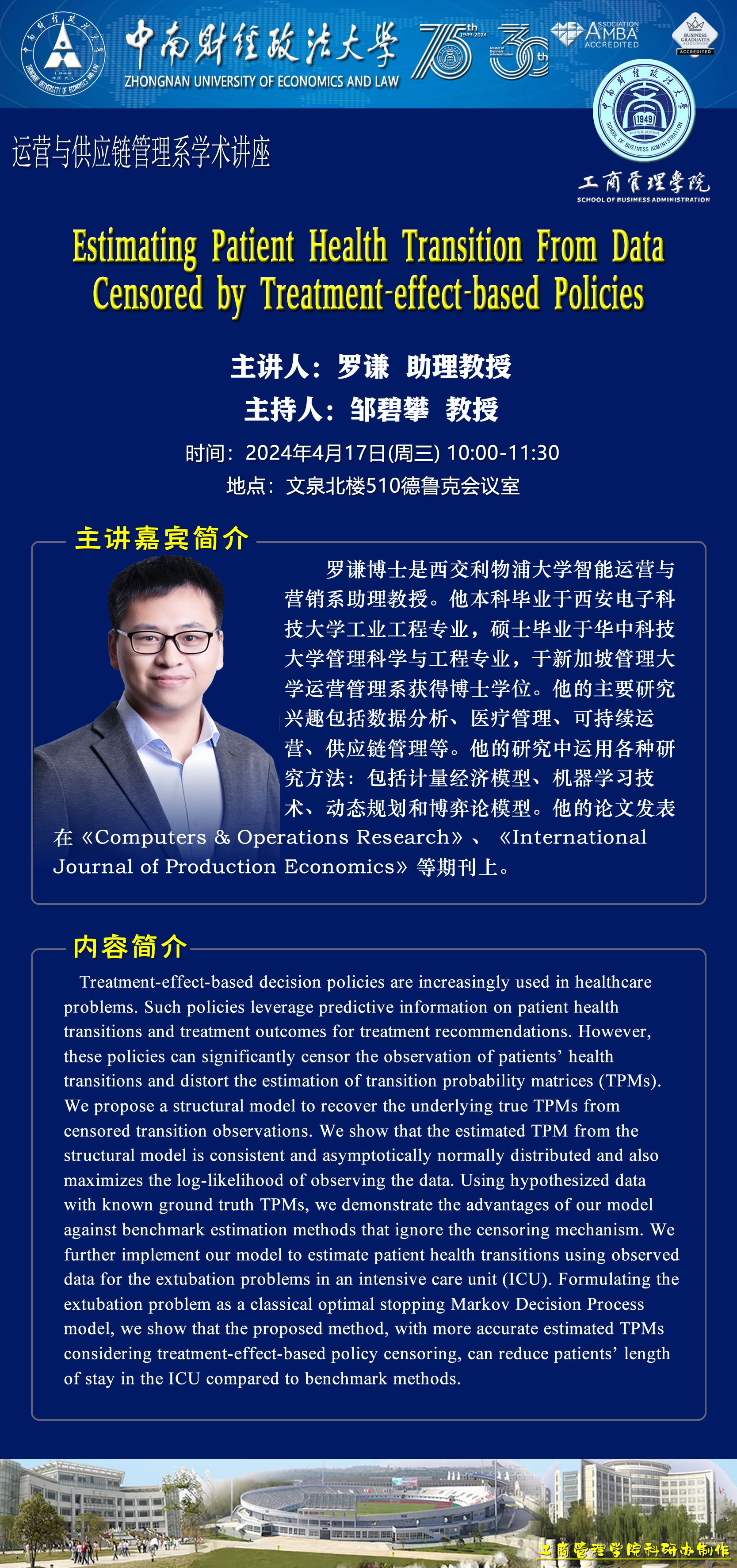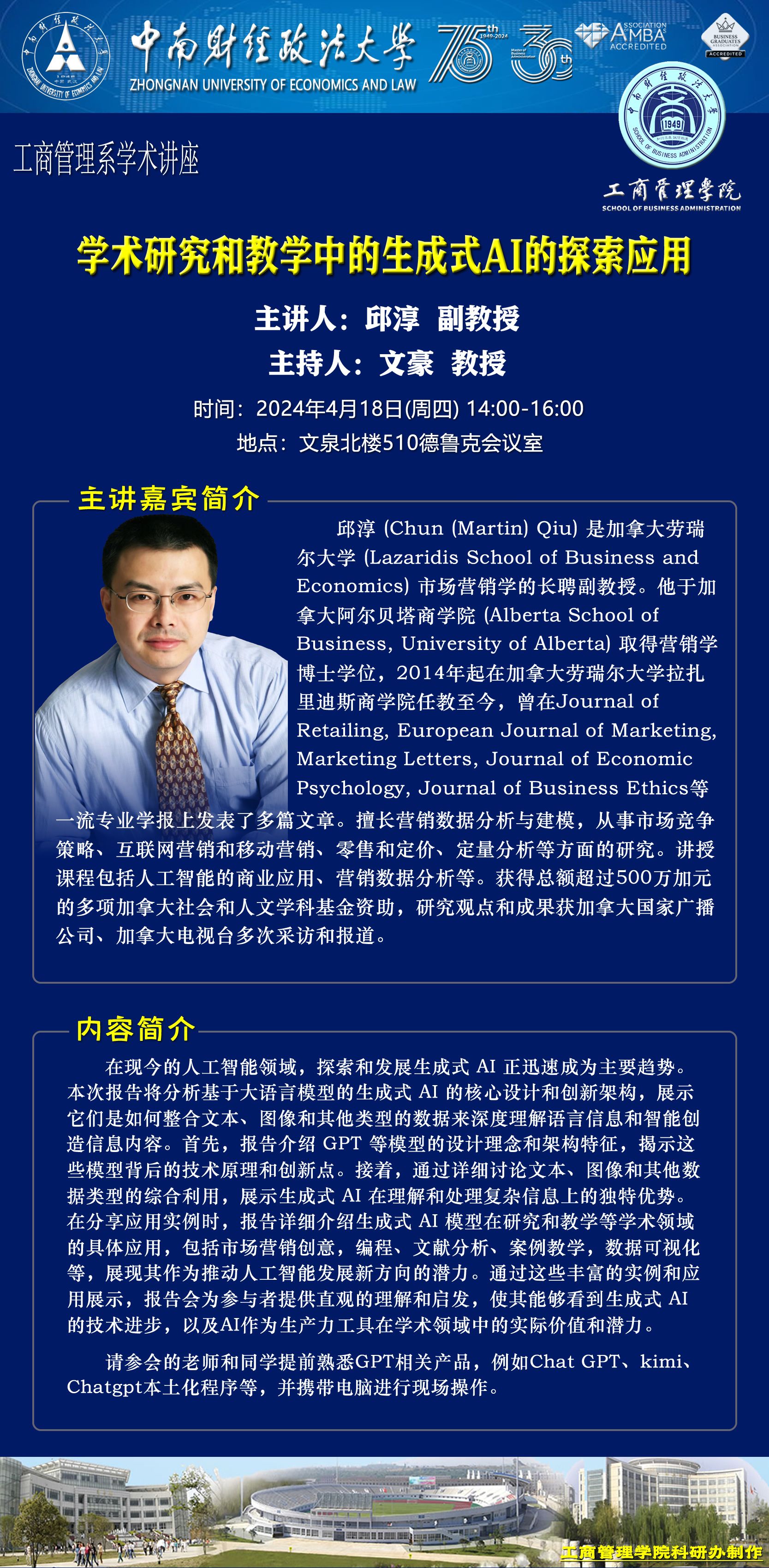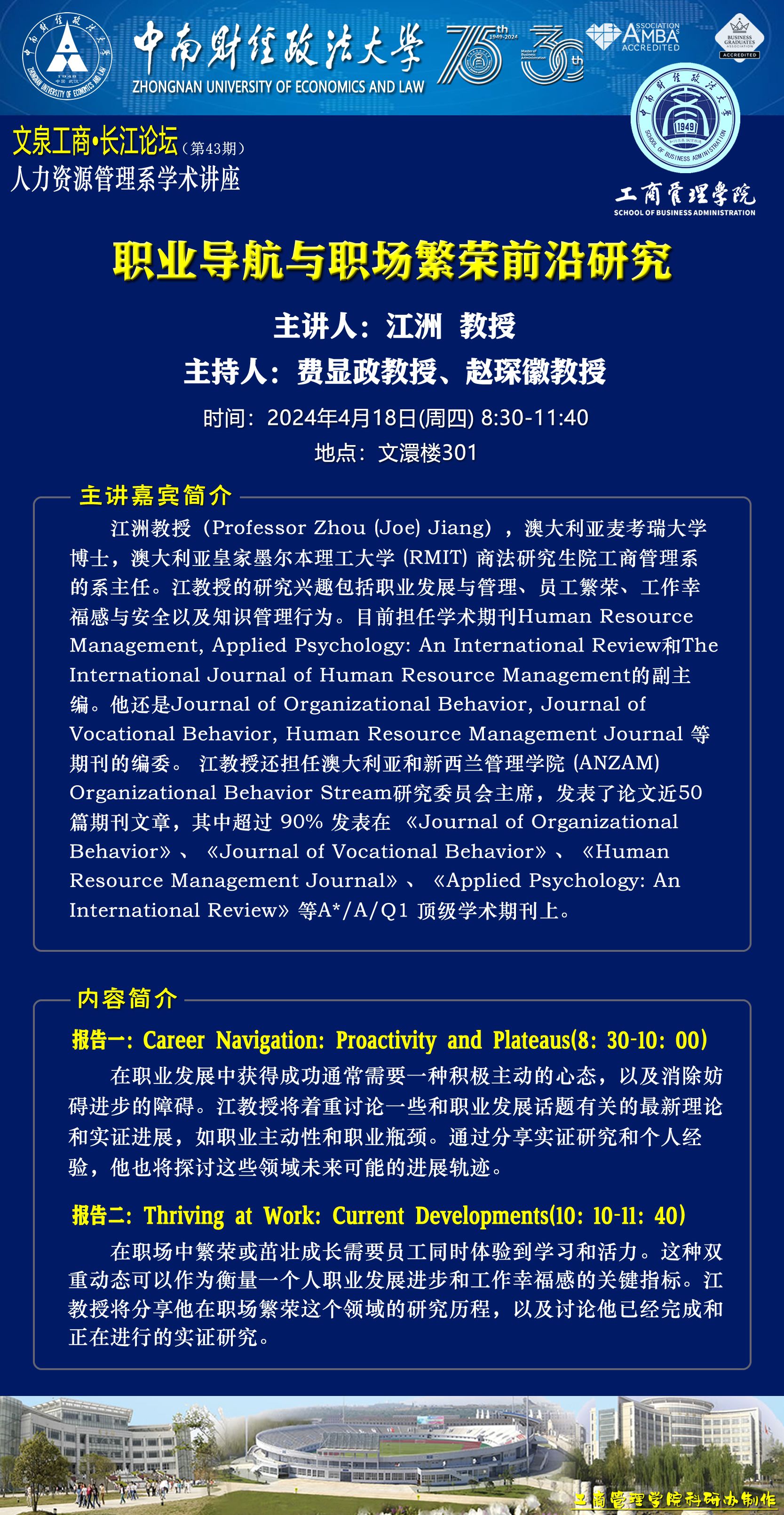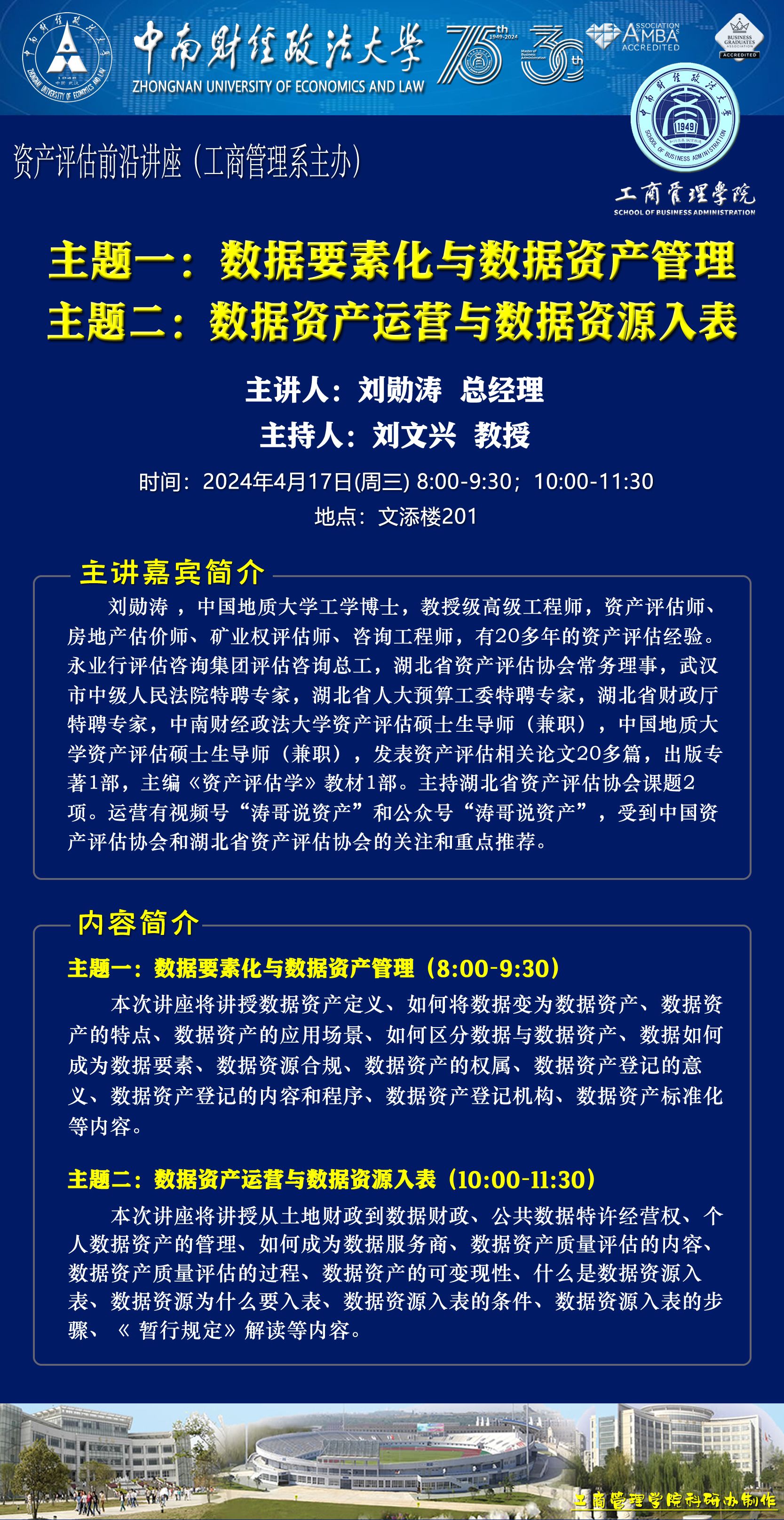 时间地点主办单位主持人主讲人主题2024.04.178:00-9:30;10:00-11:30文添楼201工商管理系刘文兴 教授刘勋涛 总经理主题一、数据要素化与数据资产管理主题二、数据资产运营与数据资源入表2024.04.17 10:00-11:30文泉北楼510德鲁克会议室运营与供应链管理系邹碧攀 教授罗谦 助理教授基于治疗效果政策形成的删失数据中病人病情转移概率估计2024.04.188:30-10:00,10:10-11:40文澴楼301文泉工商•长江论坛(人力资源管理系主办)费显政教授、赵琛徽教授江洲 教授职业导航与职场繁荣前沿研究主题一:Career Navigation: Proactivity and Plateaus主题二:Thriving at Work: Current Developments2024.04.18 14:00-16:00文泉北510德鲁克会议室工商管理系文豪 教授邱淳 副教授学术研究和教学中的生成式 AI 的探索应用
