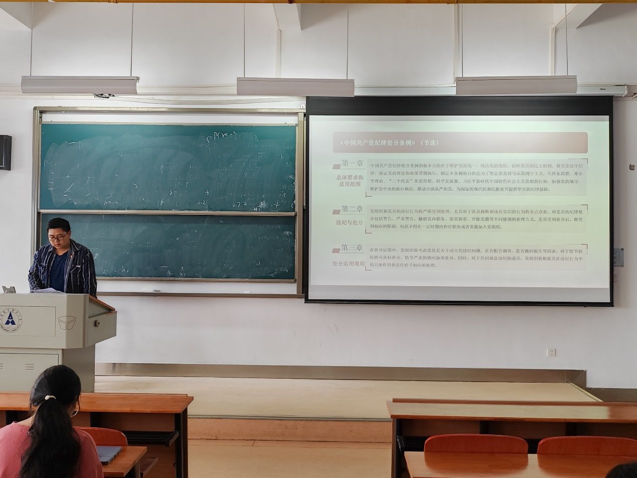 活动第八项,马闻涛同志领学《中国共产党纪律处分条例》(节选),该条例是我党全面从严治党、维护党章的重要举措,马闻涛同志领学了前六章的主要内容,强调党的纪律的重要性,使得同学们深刻的认识到严守党的纪律是党员的基本素养。