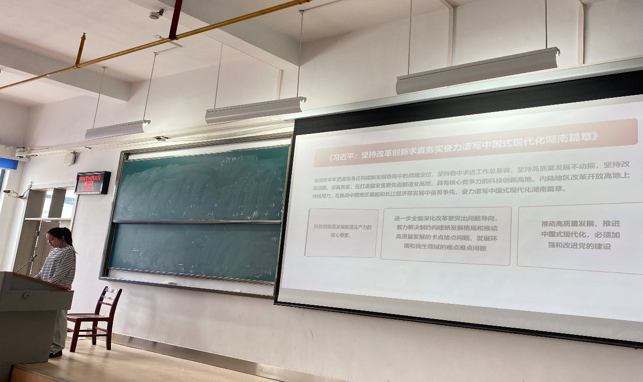 活动第五项,由王紫霏同志领学《习近平:坚持改革创新求真务实奋力谱写中国式现代化湖南篇章》,王紫霏同学重点从推动湖南全面深化改革开放、推动高质量发展、科技创新引领发展三个方面诠释了习近平总书记重要讲话精神,同学们深刻的认识到中国式现代化的实现需要坚定不移的推进改革开放与科技创新。
