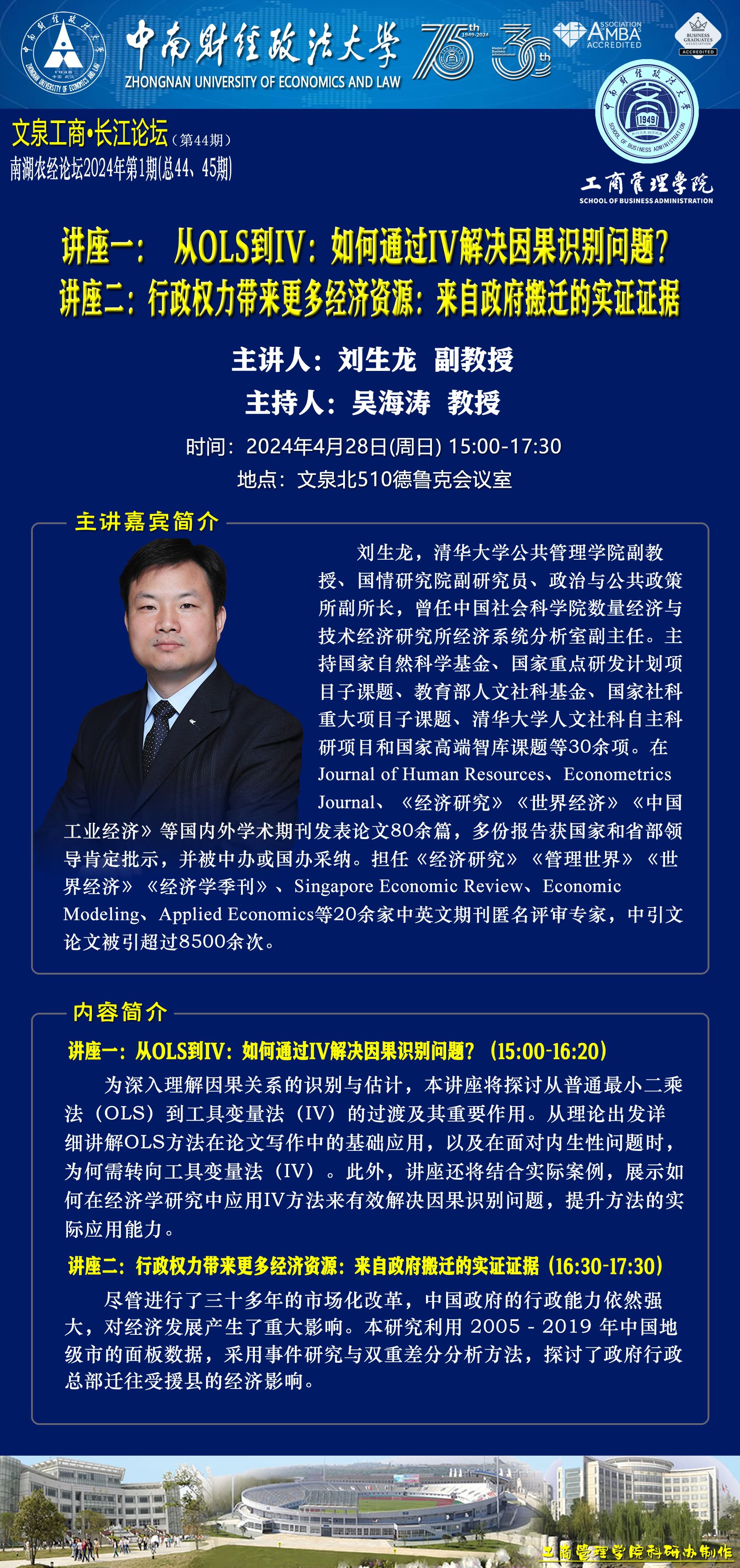时间地点主办单位主持人主讲人主题2024.04.2815:00-16:20,16:30-17:30文泉北510德鲁克会议室文泉工商•长江论坛(第44期)(农业经济管理系承办)吴海涛 教授刘生龙 副教授讲座一: 从OLS到IV:如何通过IV解决因果识别问题?讲座二:行政权力带来更多经济资源:来自政府搬迁的实证证据