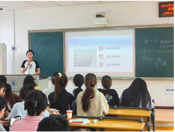 在活动中,团支书带领同学们学习了有关国家安全的知识,增强了同学们维护国家安全的意识。随后,他们了解了中国载人航天发展历程,深刻领悟了中国载人航天精神,增强了同学们的民族自豪感。