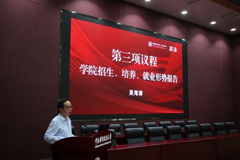 大会最后,院长兼党委副书记吴海涛教授进行学院近期重点工作部署。他主要从学院招生、培养、就业三个方面入手,深入剖析了学院当前发展中存在的问题和面临的挑战,并从大力加强招生宣传、开展就业指导帮扶、做好本科审核评估和抓好院庆活动机遇等四个方面提出行动思路。此外,吴海涛教授还对学院财务管理和新闻宣传等工作进行了部署安排。