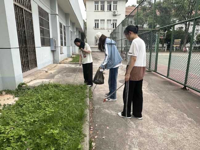 在劳动区域内,志愿者们分工合作,一丝不苟地对负责区域进行全方位的清洁工作。志愿者们专注劳动,细心地用夹子夹起地上的烟头,捡起地上的纸屑与塑料瓶,仔细检查花坛,并戴着手套拾起里面的碎屑。他们认真清洁校园里每一处角落,努力让学校环境更加整洁宜人。
