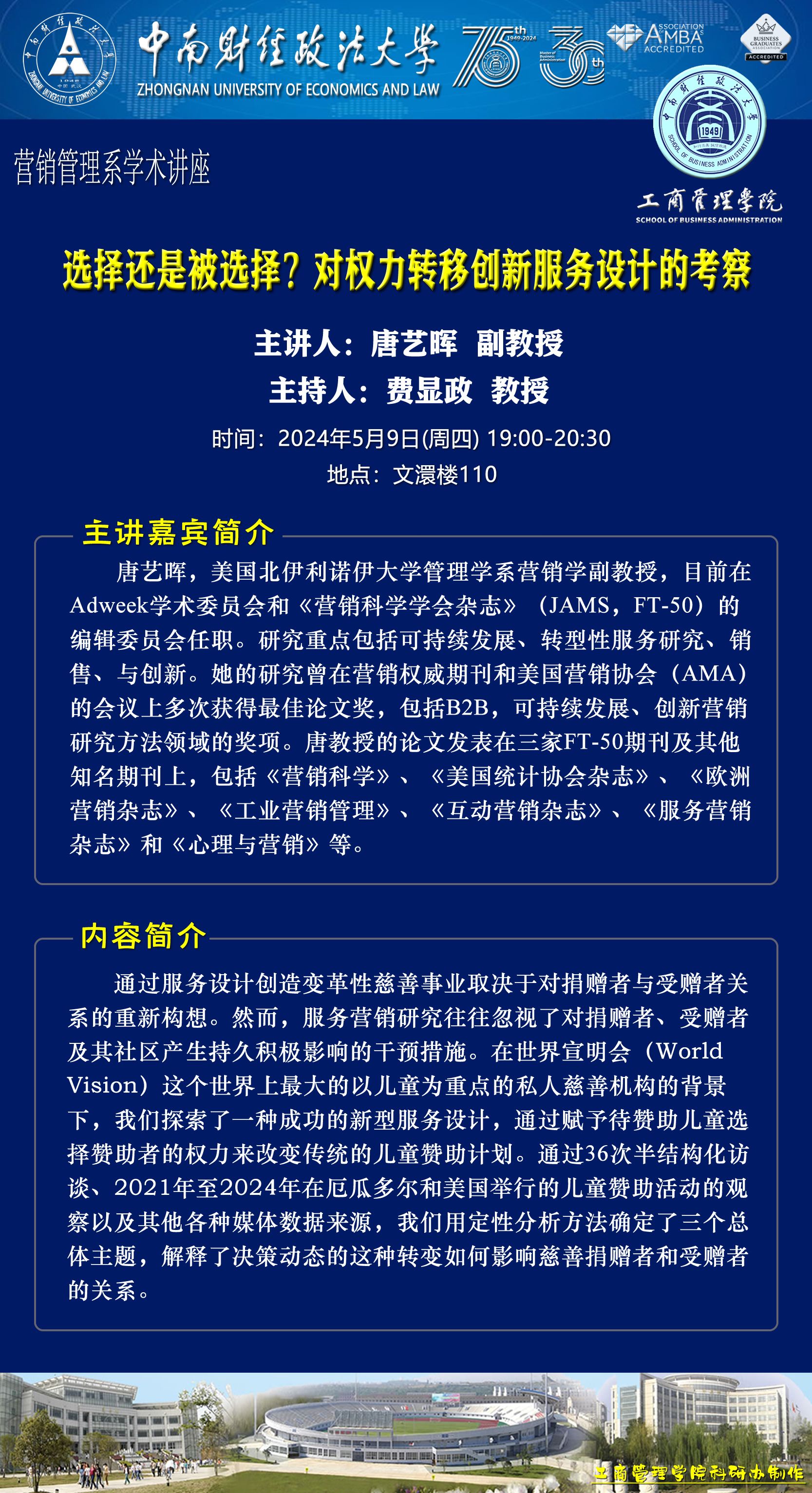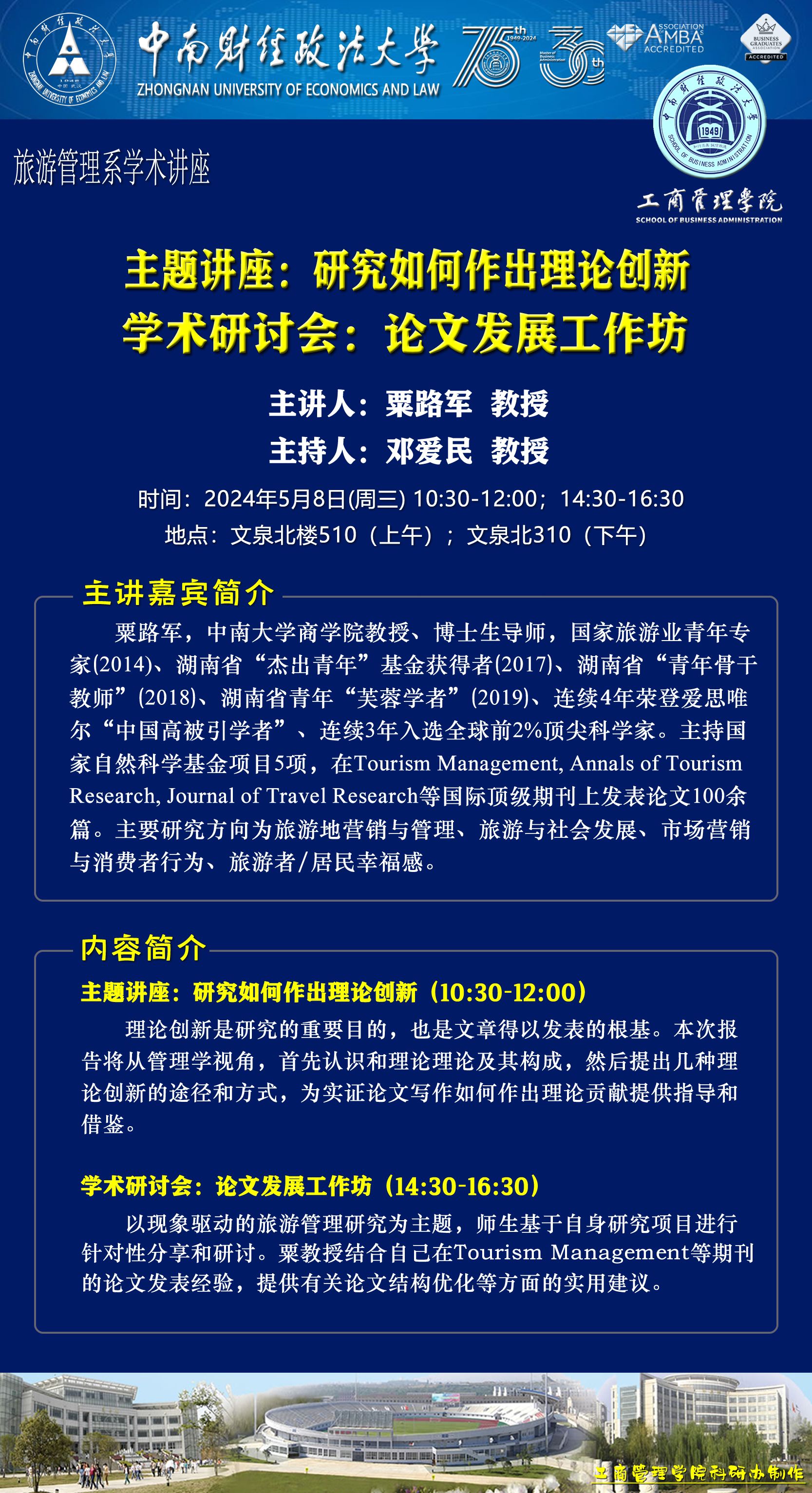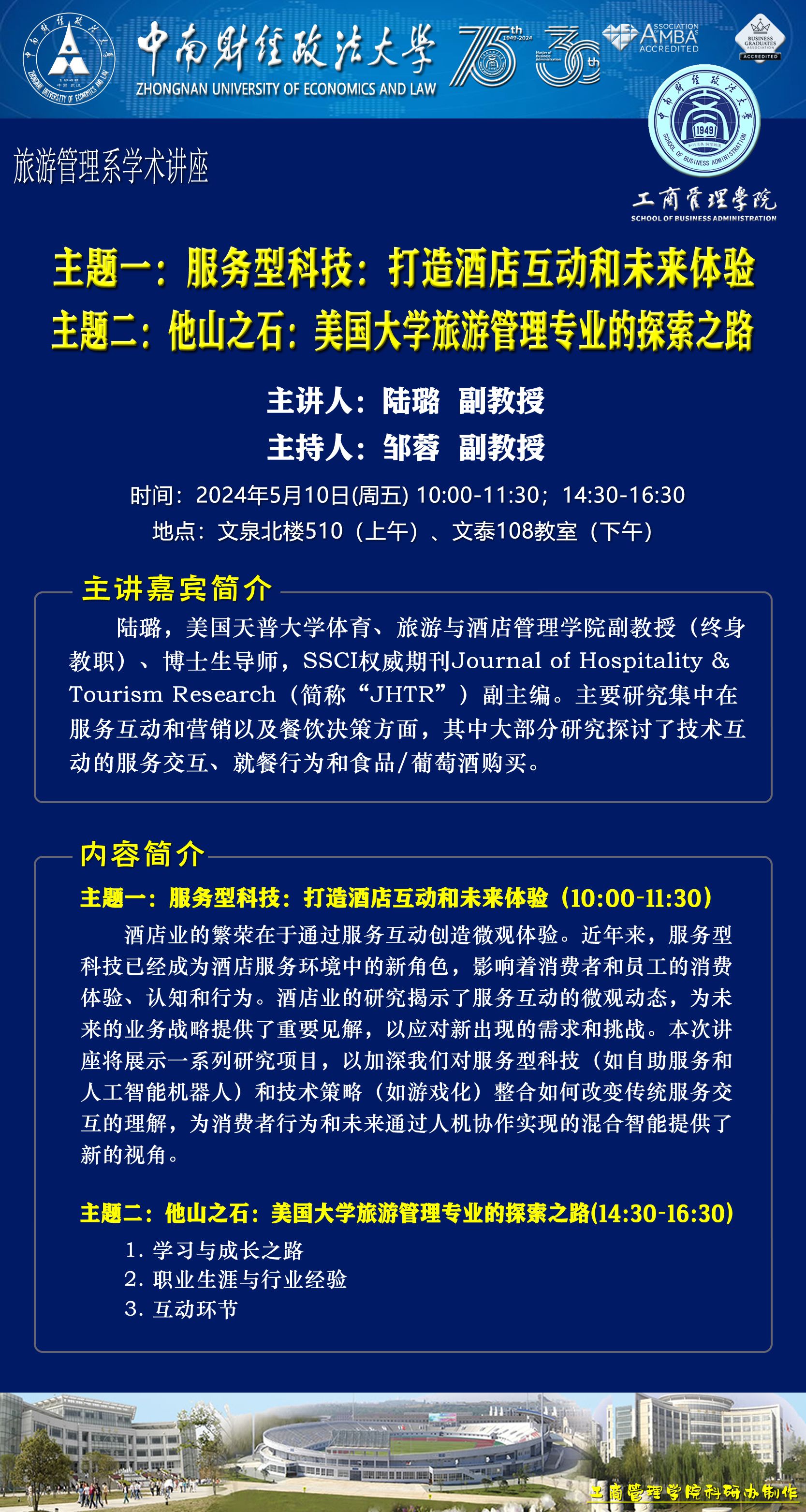 时间地点主办单位主持人主讲人主题2024.05.0810:30-12:00,14:30-16:30文泉北510、文泉北310旅游管理系邓爱民 教授粟路军 教授主题讲座:研究如何作出理论创新学术研讨会:论文发展工作坊2024.05.09 19:00-20:30文澴楼110营销管理系费显政 教授唐艺晖 副教授选择还是被选择?对权力转移创新服务设计的考察2024.05.1010:00-11:30;14:30-16:30文泉北510;文泰楼108教室旅游管理系邹蓉 副教授陆璐 副教授主题一:服务型科技:打造酒店互动和未来体验主题二:他山之石:美国大学旅游管理专业的探索之路