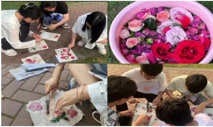 在第二个环节“吾本瑜——表现与接纳篇”的“植物拓印、色彩画像”活动中让同学们从已收集的不同颜色的树叶花草中,根据自我认知选取对应的植物,并简单的布局,而后进行画布拓印,塑造属于自己的图画。这一活动结合色彩性格模型,让同学们在艺术创作中找到了心灵的慰藉,人如其画,人亦和谐。