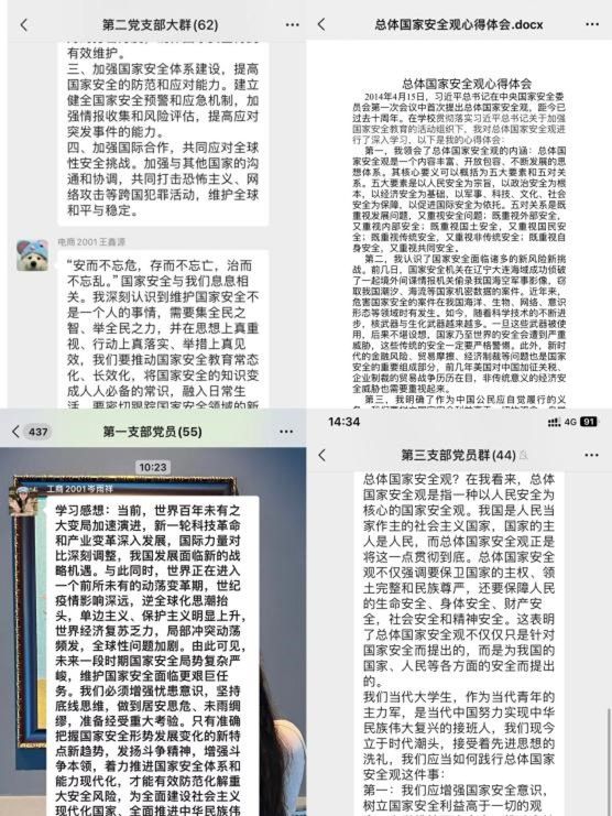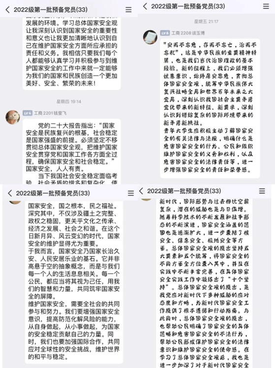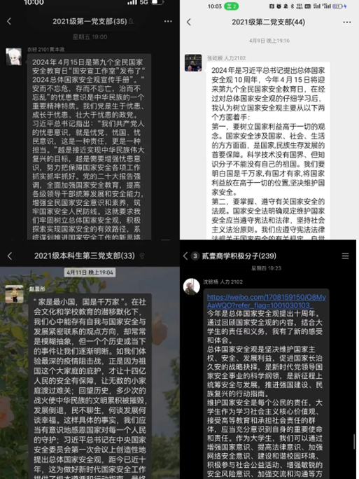在深入学习“总体国家安全观”的背景下,各年级党支部积极组织开展一场学习大讨论。同学们以接龙的形式在年级群内分享各自的学习心得体会,并结合身边的实际案例分析当前国家安全面临的形势和挑战,就如何有效维护国家安全提出了自己的见解和建议。
