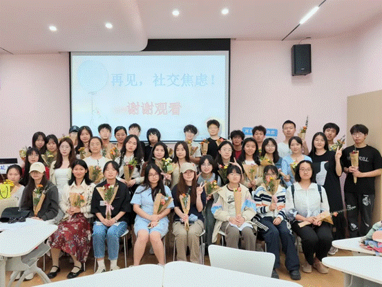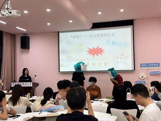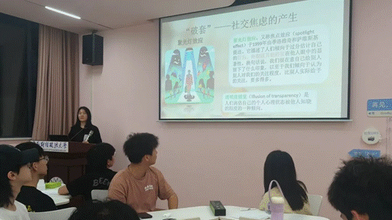 接下来是心理自查环节,大家填写心理小测验并分享自己的故事。温家庆同学分享了自己的自查表,并结合自身的经历,点出社交焦虑给大家带来的负面影响,表达了对“破套、解套”的期待。朱缇珏同学向大家分享了“仰巴脚效应”,也叫“出丑效应”,表达出最完美的人不一定受到大家的喜爱,优秀而又暴露出一点儿小缺点的人反而更能赢得他人的喜爱。
