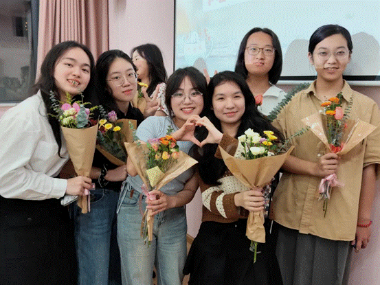 3、送你一束小彩花:同学们通过邀请函副票抽签的方式确定了送花对象,从自己的视角出发为对方选取3-4种颜色的花(根据其性格特点),包装成花束送给对方,并在送花时向对方分享选择原因和“我眼中的他/她”,最后合影留念。