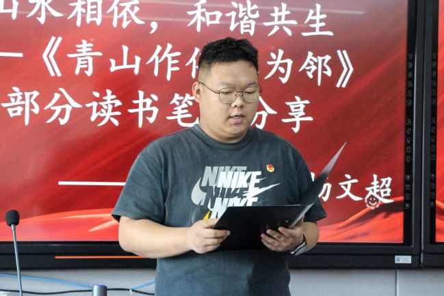 生活权益部的杨文超从书本与自身部门工作的联系出发,谈到:他深感国家对于生态文明建设的重视和投入,我们作为中南大学子和新时代青年,我们要从自己做起,从小事做起,让绿色成为我们生活的底色。