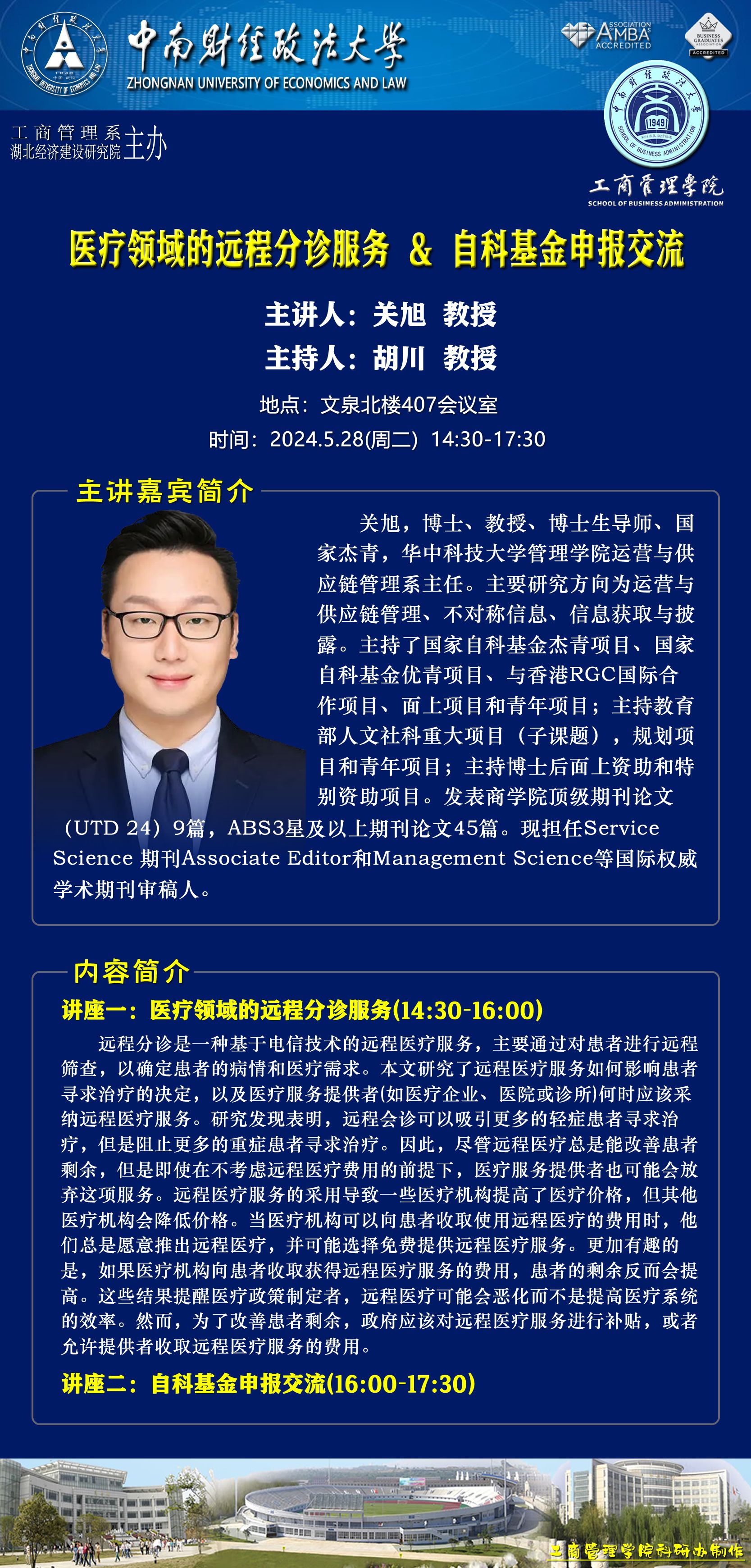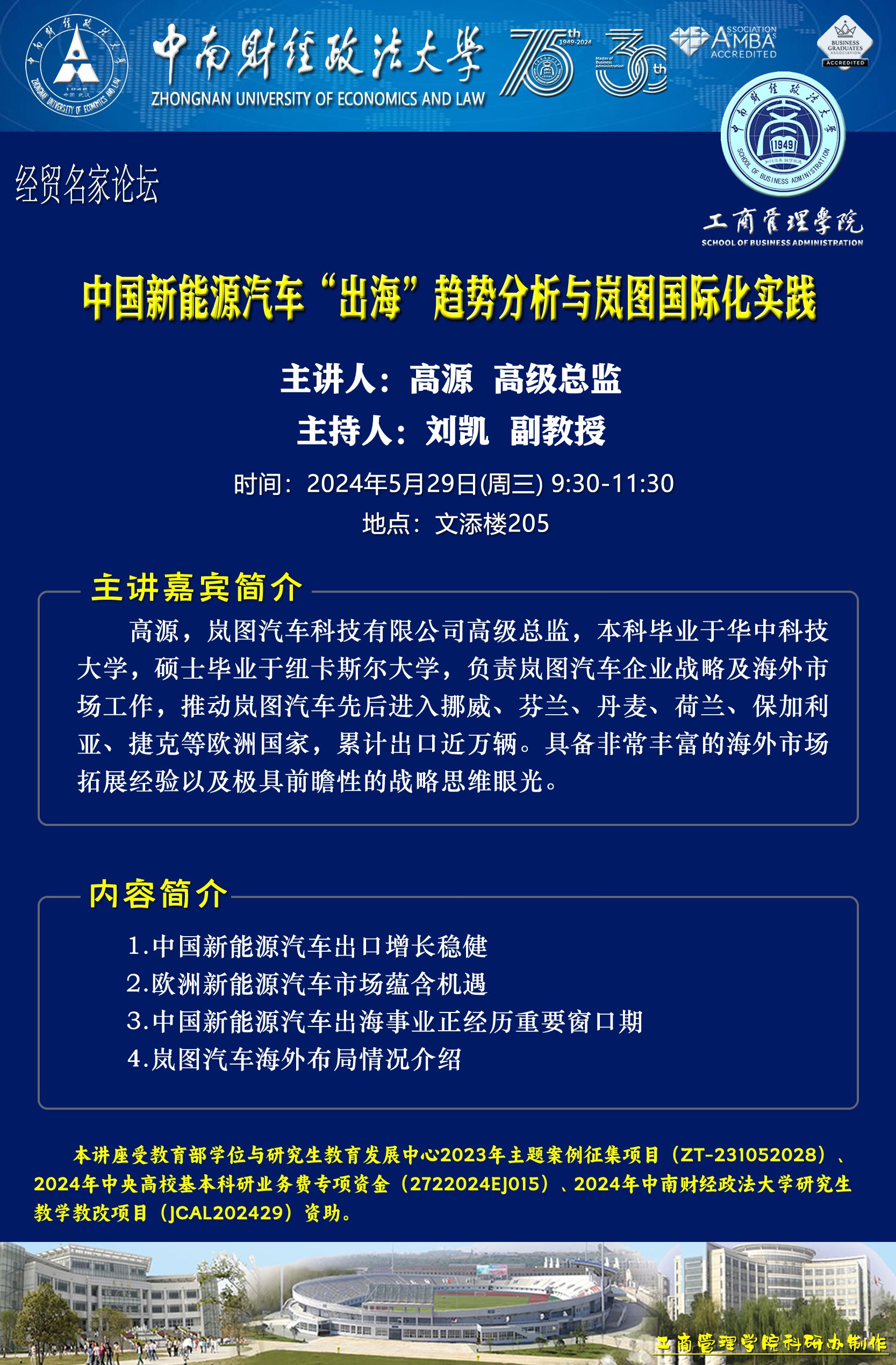 时间地点主办单位主持人主讲人主题2024.05.28 14:30-17:30文泉北407会议室工商管理系、湖北经济建设研究院胡川 教授关旭 教授一、医疗领域的远程分诊服务二、国家自科基金项目申报交流2024.05.29 9:30-11:30文添楼205经济贸易系刘凯 副教授高源 高级总监中国新能源汽车“出海”趋势分析与岚图国际化实践2024.05.29 14:00-15:30文泰216营销管理系刘新燕 副教授郑光辉 执行总裁中国新能源汽车产业发展趋势解读