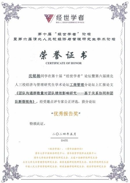 (通讯员沈铭杨)5月12日,第十届“经世学者”论坛暨第六届清北人三校经济与管理研究生学术论坛在清华大学举行,我院本科生人力资源管理专业沈铭杨、工商管理专业赵羚祾、人力资源管理专业朱芳圣合著的论文《团队沟通群数量对团队绩效影响研究——基于关系协同和团队断裂视角》从500余篇学术论文中脱颖而出,经过两轮评审的严格筛选,最终进入线下论坛宣讲,并获优秀报告奖。