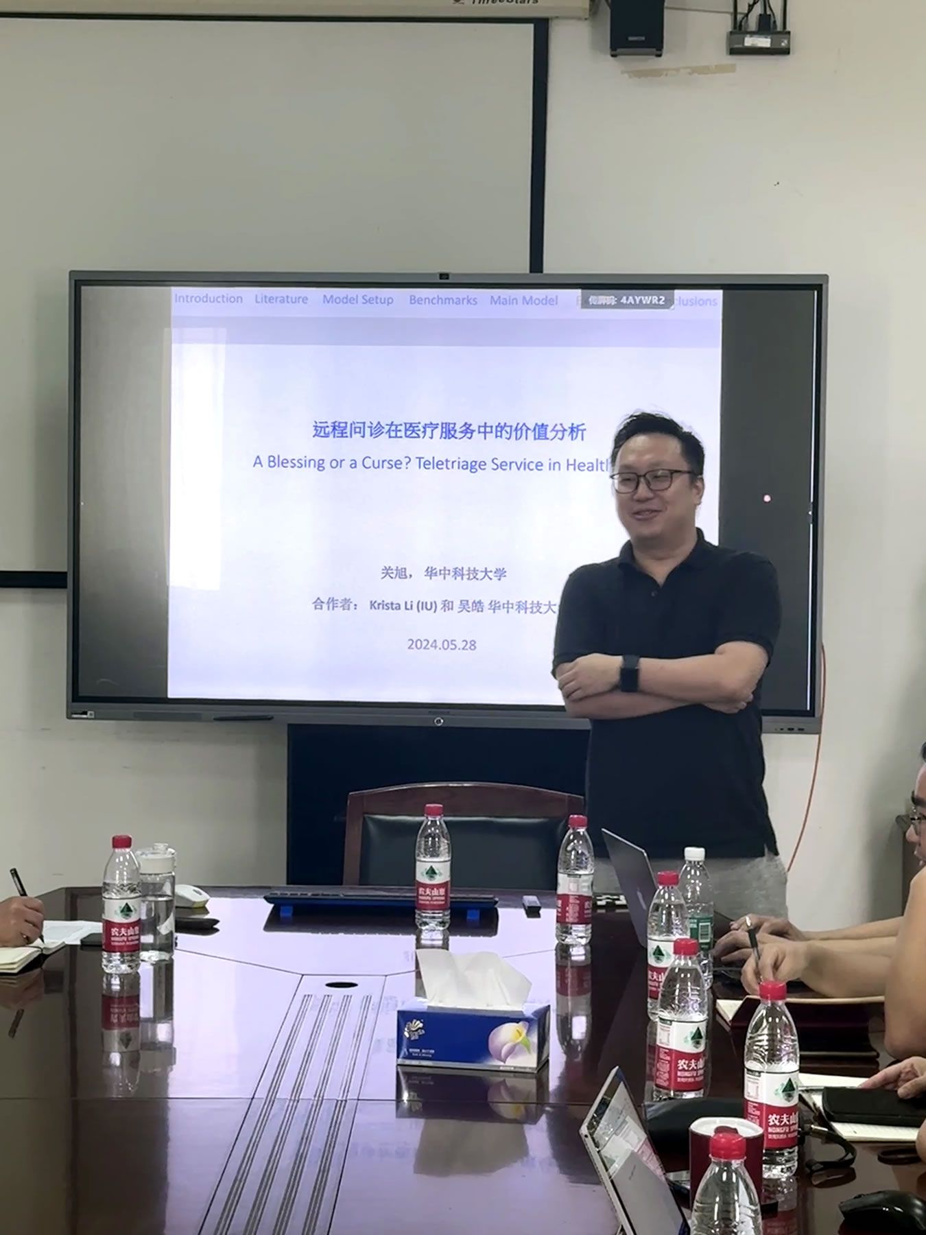 讲座第二项,关旭教授分享了其最新研究成果:一篇探讨“医疗领域远程分诊服务”的在投论文,详细论述了远程分诊服务的核心功能及其对患者就医决策和医疗服务提供者采纳条件的影响。论文揭示了远程服务费用可能提升患者剩余,这一发现引发了对于远程医疗可能如何影响医疗系统效率的新思考。此外,关旭教授分享时强调,撰写模型类文章需注重技术和体感。体感指文章与日常生活紧密相关,能使读者产生共鸣。这篇文章就是体感较强的一篇文章,通过围绕就医场景,增强文章可读性和现实意义,