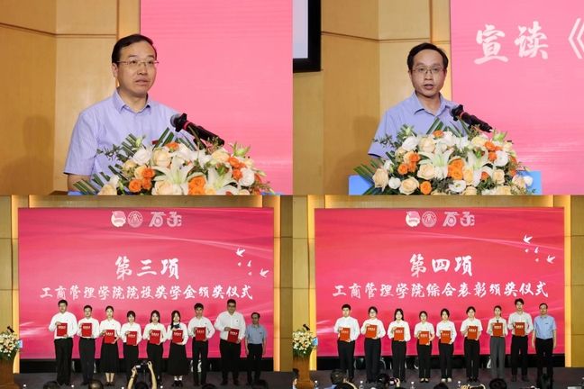 吴海涛院长《工商管理学院关于2023年“励志”“学习之星”“文华”“育贤”院设奖学金的表彰决定》,并为获奖学生代表颁奖。