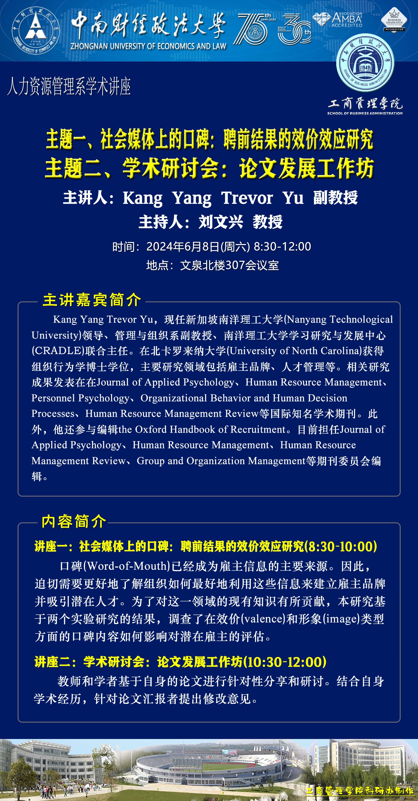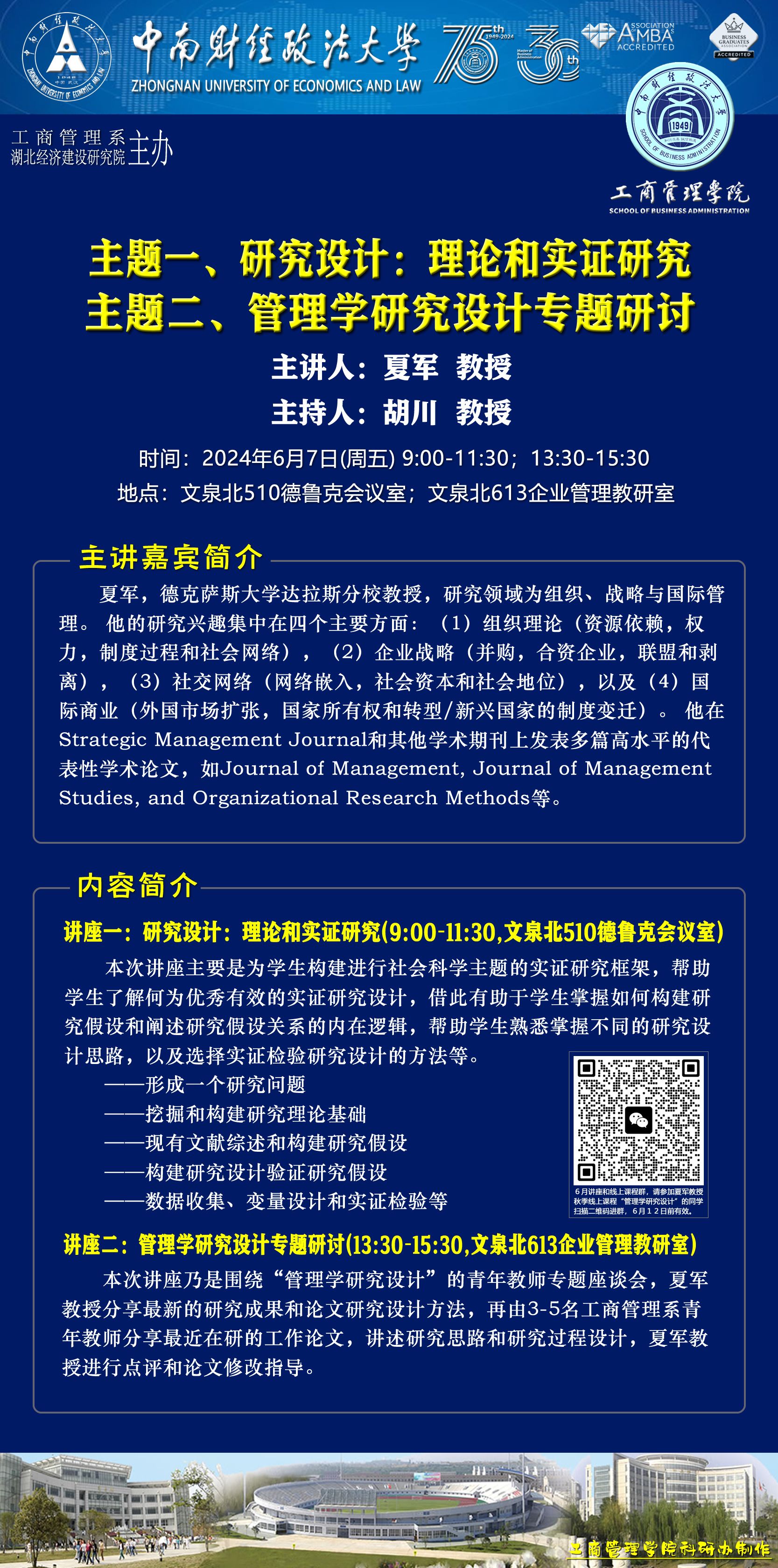 时间地点主办单位主持人主讲人主题2024.06.079:00-11:30;13:30-15:30文泉北510德鲁克会议室文泉北613企业管理教研室工商管理系、湖北经济建设研究院胡川 教授夏军 教授主题一:研究设计:理论和实证研究主题二:管理学研究设计专题研讨2024.06.088:30-10:00,10:30-12:00文泉北楼307会议室人力资源管理系刘文兴 教授Kang Yang Trevor Yu 副教授主题一、社会媒体上的口碑: 聘前结果的效价效应研究主题二、学术研讨会:论文发展工作坊