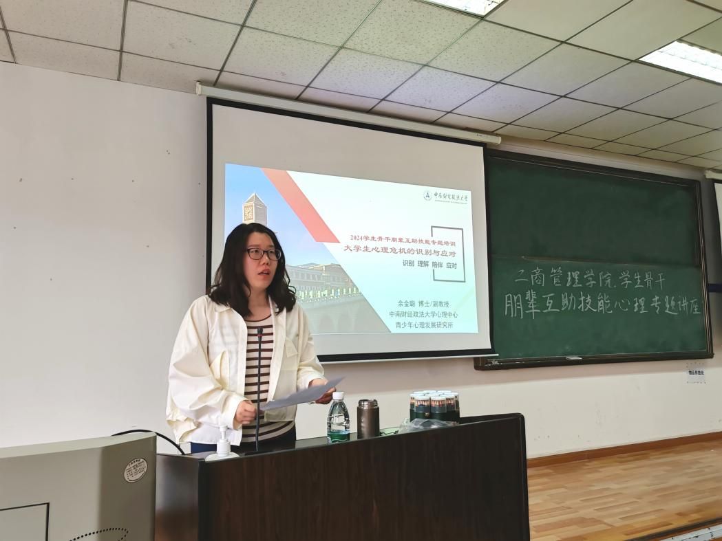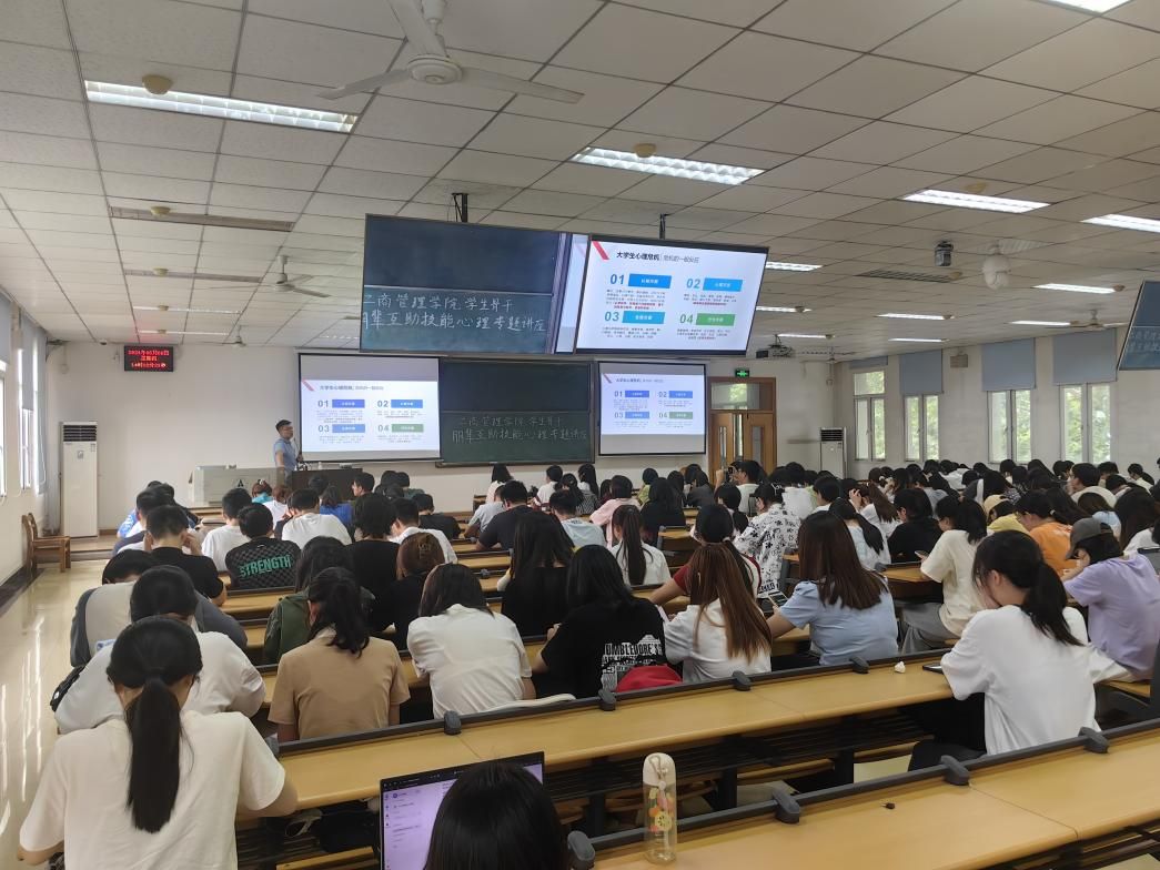 (通讯员:王臻 王茹钰 摄影:冯元煦 杨雯钧)心向阳光,晴满校园。为更好发挥学校四级心理预警机制,构建上下联动、高效衔接的心理健康教育工作格局,工商管理学院于6月6日在文润303教室举办朋辈互助心理技能专题讲座。本次讲座邀请我校心理中心青少年心理发展研究所专职教师、国家二级心理咨询师余金聪老师主讲,由工商管理学院本科2020级辅导员范梦宇老师主持,工商管理学院本科2023级全体班委及寝室长参加。