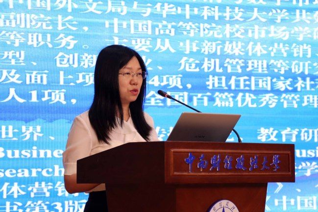 华中科技大学管理学院副院长戴鑫教授作主题为《如何在国际社交媒体上讲好中国美食故事——国家文化营销视角下的食物旅程叙事策略大数据分析》的报告。戴鑫教授团队借助大数据分析工具,搭建了研究食物旅程叙事策略的理论模型,运用图表清晰地展示了对国内美食博主的研究结果,通过比较他们对食物、人物和国家三个要素关注度的相关数据,分析产生差异的原因。他运用描述统计和组合的方法,将叙事策略分为四类,对比推导出外国人的心理机制,指出了现阶段存在的问题并提出改进提升的建议。此外,戴鑫教授还与同学们积极互动,基于研究结果和相关知识,详细回答了同学们的现场提问,深化了同学们对国家文化营销手段和食物旅程叙事策略的理解和认识。