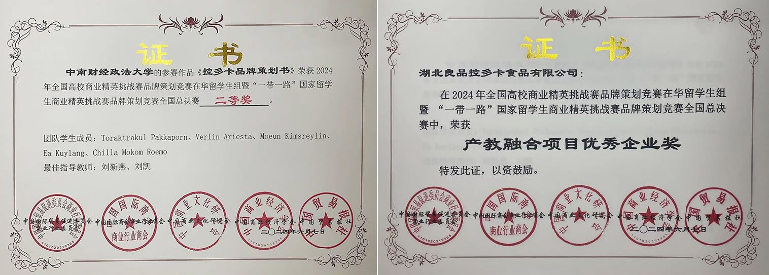 在工商管理学院的刘新燕和刘凯两位老师的带领下,我校四位留学生组成的“品牌师傅队”,在获得湖北良品控多卡食品有限公司的支持和授权后,为其轻食产品进入泰国市场撰写的品牌策划方案在激烈的角逐中脱颖而出,荣获国家二等奖。