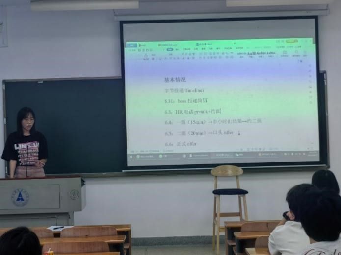 市营2201班郭烁璇同学向大家做实习分享。郭烁璇同学讲到,自己从去年寒假开始就打算今年暑假找一份实习,她从基本情况、前期准备、面试阶段三个方面向大家分享了找实习的经验。她先向大家介绍了自己投递字节的时间线:boss投递简历、HR电话pretalk+约面、一面、二面、给出正式offer。在前期准备阶段,她向大家分享如何写简历以及投递渠道,最后分面试前、面试中、面试后告诉大家如何准备面试以获取心仪的offer。