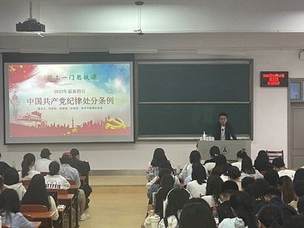 2024年4月18日晚,胡川副院长为学院发展对象和预备《中国共产党纪律处分条例》(2023年最新修订)》党课。他从为何要再次修订《条例》出发,讲解了新《条例》的修订内容,带领学员们学习了新《条例》的重点内容。对于怎样认真遵照执行《条例》,他提出了三点建议:一是在服务党和国家大局中学习领会《条例》的主旨要义;二是加强党纪学习教育,增强遵规守纪自觉;三是敢于善于斗争,严格精准执纪。