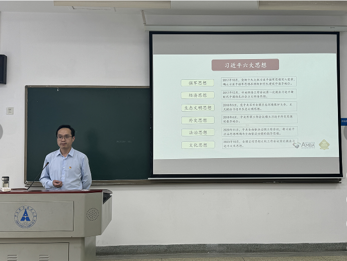 工商管理学院院长吴海涛教授为入党积极分子讲授第一课:《思想之光:习近平文化思想》。吴院长向同学们简要阐述了习近平六大思想,他指出,文化是根本、是指引我们前进的思想之光。接着从思想内涵、理论贡献、形成过程以及实践体系四个方面展开了具体解析。立足于坚持马克思主义在意识形态领域的指导地位,党的文化领导权以及坚持中国特色社会主义文化发展道路等十二个部分,吴院长向大家详细论述了习近平文化思想的丰富内涵,并用“明体达用,体用贯通”八个字精炼概括了习近平文化思想。吴院长还从五个方面深刻分析了习近平文化思想的理论贡献,讲述了习近平文化思想的形成过程,从“七个着力”概括习近平文化思想的实践体系。