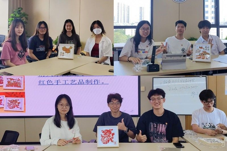 活动第五项,全体成员分组制作红色传统手工艺品——竹编画。两个支部同学们分工协作,将竹篾固定好后,按照一挑一压的方法将剩余的竹篾穿插其中,再把所有的材料安装在相框中固定,最后得到了“南湖红船”“盛世中华”“我爱中国”等红色主题竹编画。这让同学们在领略传统手工艺之美的同时,也激发了大家的爱国主义热情与民族自豪感。