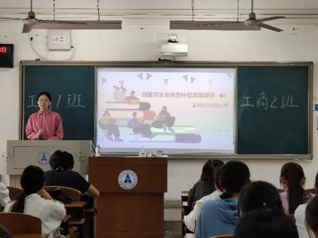 随后,工商2202班孙佳雯同学向大家介绍了白莲河水库生态补偿政策的调研情况,介绍了生态补偿政策的具体内容和调研过程中的困难与挑战。她强调大家在面对问题时要加强沟通,明确问题发生的根本,才能针对性地解决问题。
