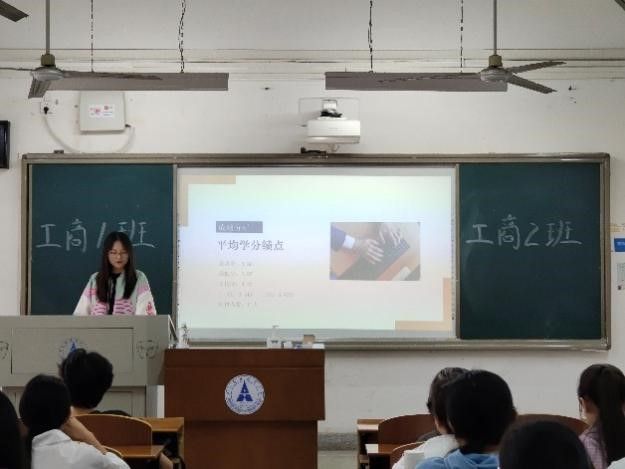 完成了暑假社会实践的分享,工商2202班学习委员张潇文进行了上学期学情分析。通过加权平均成绩、排名分布情况等方式,指出同学们在上学期学习上的优点与不足,对新学期学习内容进行了展望。