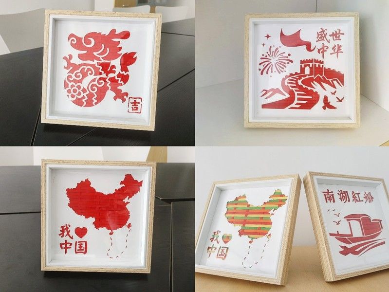 活动第五项,全体成员分组制作红色传统手工艺品——竹编画。两个支部同学们分工协作,将竹篾固定好后,按照一挑一压的方法将剩余的竹篾穿插其中,再把所有的材料安装在相框中固定,最后得到了“南湖红船”“盛世中华”“我爱中国”等红色主题竹编画。这让同学们在领略传统手工艺之美的同时,也激发了大家的爱国主义热情与民族自豪感。