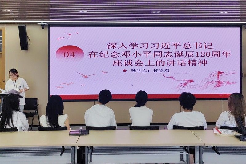 接着,工商学院林欣然同学领学习近平总书记最新重要讲话和重要指示精神。深入学习习近平总书记在纪念邓小平同志诞辰120周年座谈会上的重要讲话,带领着大家回顾邓小平同志的光辉一生,激励着同学们传承邓小平同志的崇高革命风范、创造性地学习运用邓小平理论。