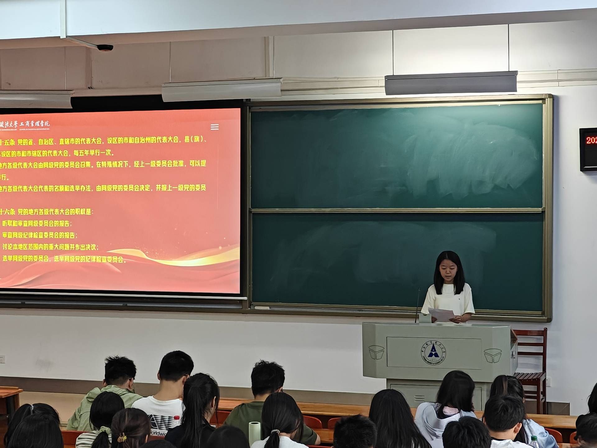 领学人聂羽辰同学带领大家学习了《中国共产党章程》和新修订《中国共产党纪律处分条例》,讲述了党的代表大会名额确定方式和选举办法,明确了权力来源。此外,他还强调了党的纪律以及处罚方式,要做知法守法的合格党员。