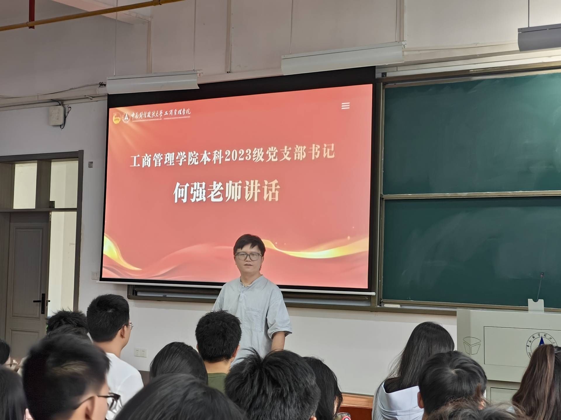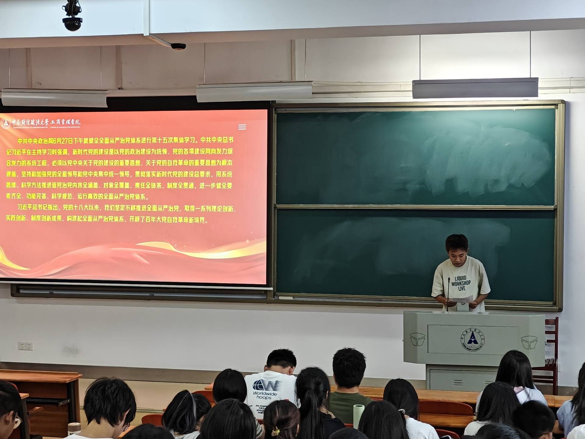 会议第一项,党支部书记何强老师讲话,何老师重点强调了党员纪律问题,党日活动要求严肃认真,对待个人材料同样需要细致认真。此外,何老师再次说明了入党积极分子的考察要求,鼓励同学们积极参加党组织举办的活动,在志愿服务中成长。最后,何老师强调了政治素养的重要性,要求同学们关注时政,积极学习党的二十届三中全会精神,提高思想层次。着重讲了党的二十届三中全会的内容,包括进一步全面深化改革、推进中国式现代化等内容。