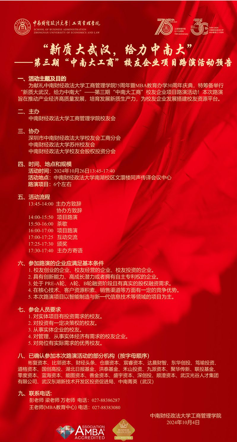 75周年院庆|“新质大武汉,给力中南大” ——第三期“中南大工商”校友企业项目路演活动预告