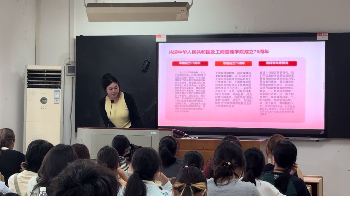 “七十五载逢盛世,同心共筑谱华章。”团支书陈恩之同学在初步介绍会议流程后开始了班会背景介绍环节,带领全班同学观看中华人民共和国成立七十五周年的短视频,进一步学习了新中国一步步走来的光辉历程,加深了对中国式现代化的理解。而后分祖国华诞、学院庆生、商科青年三个模块介绍会议背景,使同学们心中的红色旗帜鲜明飘扬,奋斗之魂熠熠燃起。