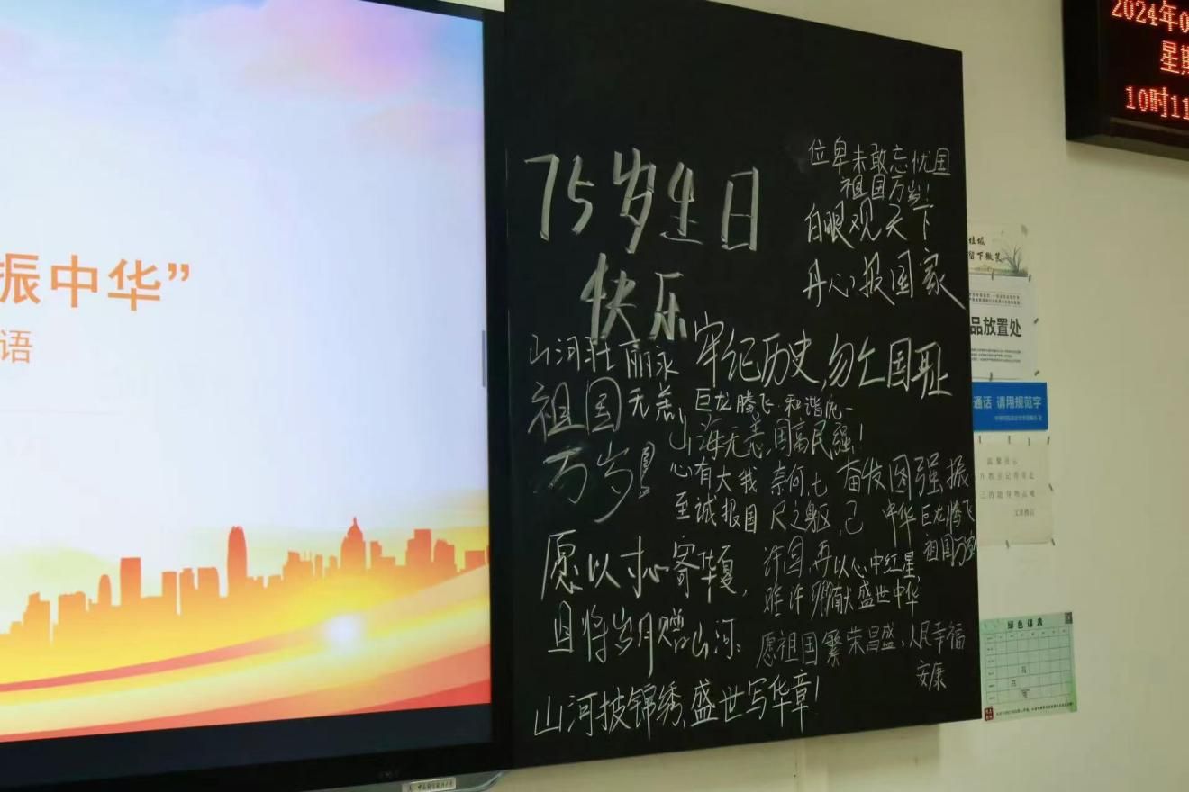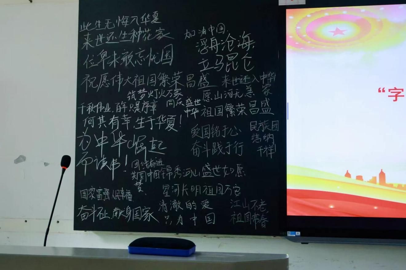 活动最后,全体团支部成员起立,由团支书李萌领头一同在教室黑板上写下对祖国的寄语,在深情的背景音乐中,本次团日活动圆满落下帷幕。