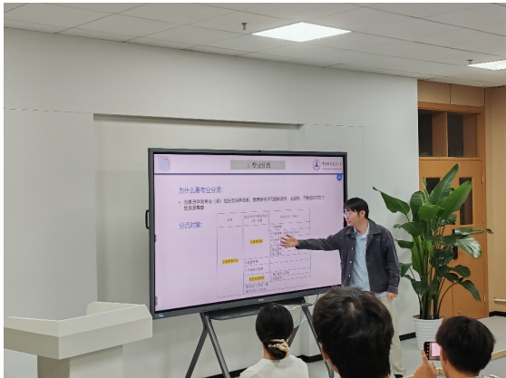 团日活动第二环节,由班导徐老师首先对专业分流的时间、通知、规则、历届信息等事项进行介绍,并现场解答了部分同学的疑虑。接着针对考研保研的准备周期、时间线、建议进行详细介绍,解读了保研考研的相关政策和流程,提醒同学们合理规划。最后,张靖淇师姐以自身经历为例,从个人定位、资料准备等方面进行了全面讲解,鼓励同学们积极参加科研项目,提升自己的综合素质。