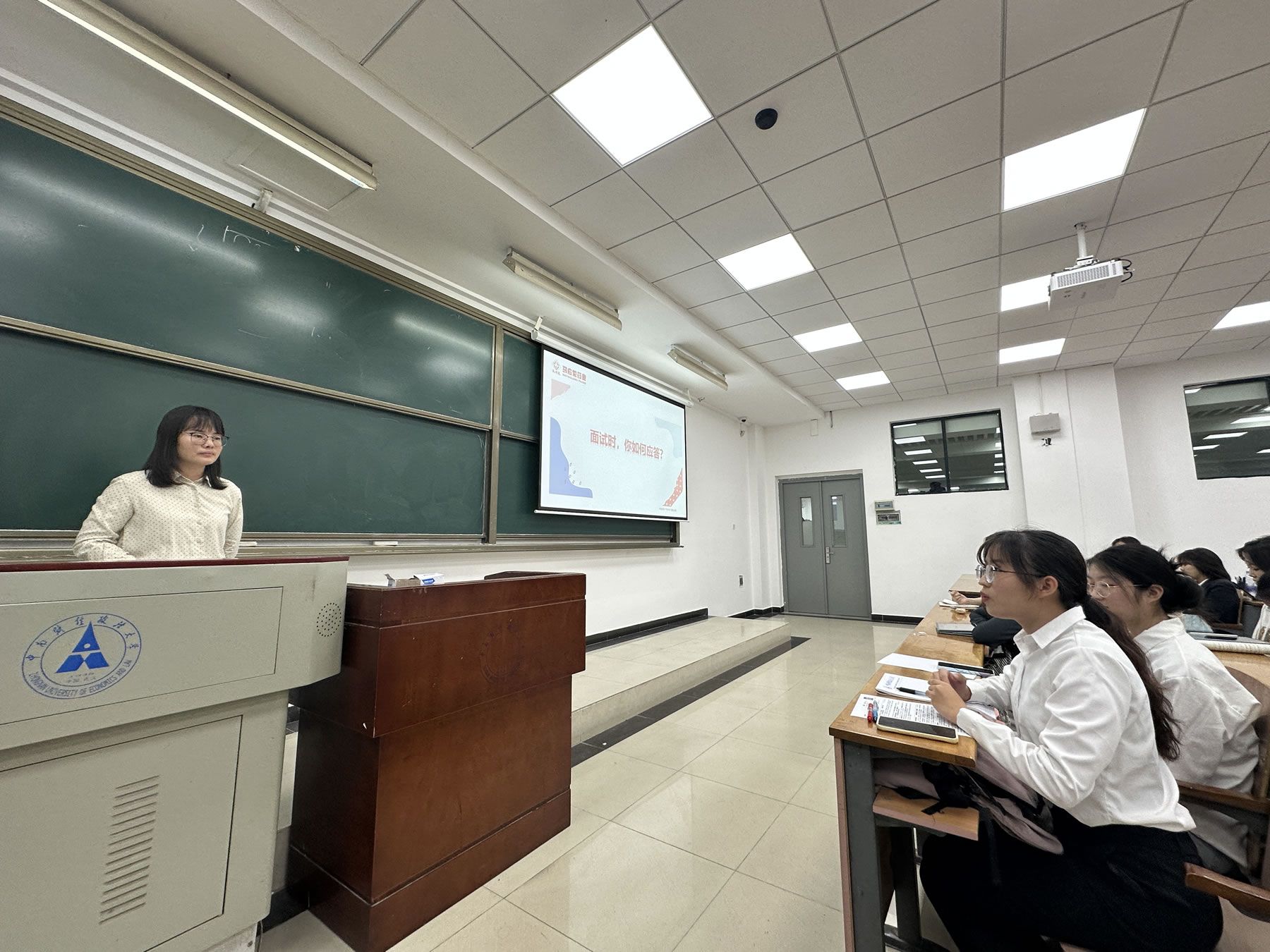 面试不慌,Offer翻番。不同于用面试者视角打开求职之路,张女士为同学们呈现了HR面试考察的流程:HR善用认知能力、性格等测评方式多维度分析面试者性格能力,在提问中融入STAR法则了解对方素养技能,利用AI工具快速筛查海量简历精准定位人员。不仅如此,现场还上演了一次1v1销售管培生模拟面试,经过几轮提问,张女士根据学生表现给出精确点评,为同学们日后面试提供参考思路。